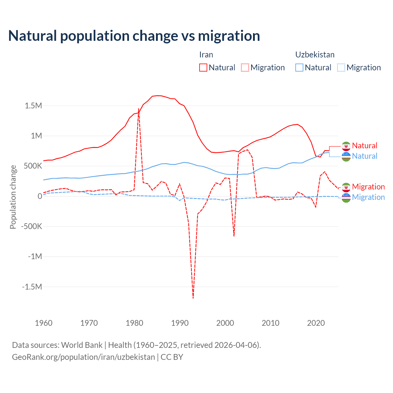 Over the last 10 years, 92.5% of the population change in Iran is from natural causes (a gain of 9,405,860 people) and 7.46% is from migration (a gain of 757,979 people). In Uzbekistan 98.2% is from natural causes (a gain of 6,161,117 people) and 1.84% is from migration (a loss of 115,398 people).