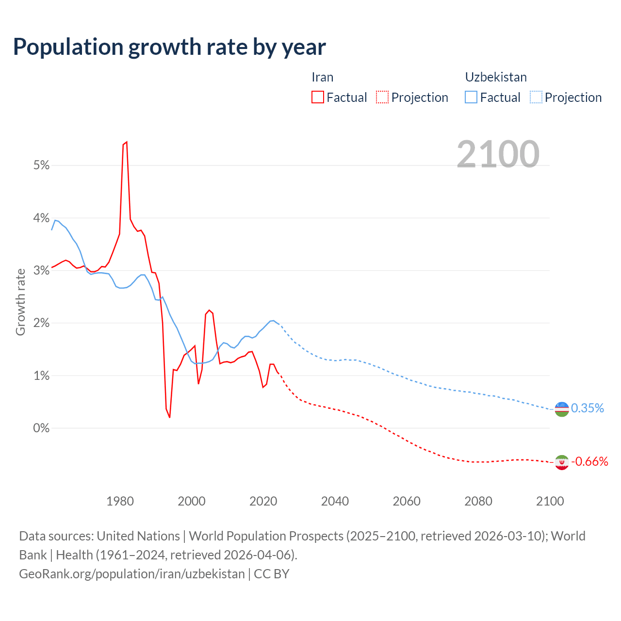- For the last 10 years, Iran has had an average growth rate of +1.19% per year vs +1.85% in Uzbekistan.
