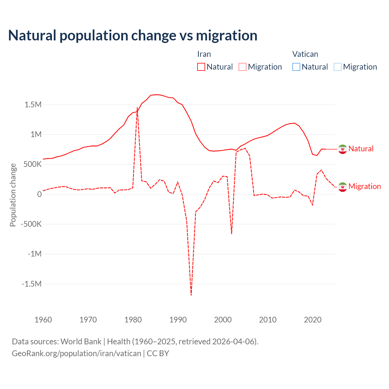 - For the last 10 years, Iran has had an average growth rate of +1.19% per year vs +1.9% in the Vatican.