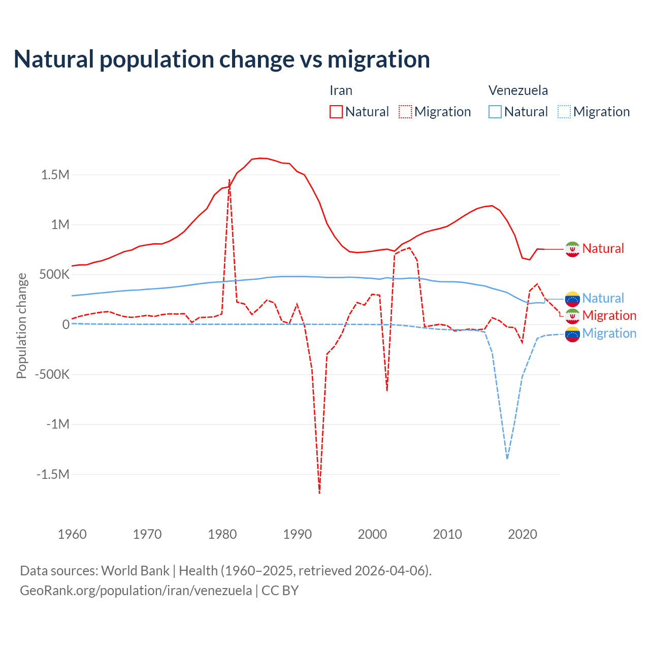 Over the last 10 years, 92.5% of the population change in Iran is from natural causes (a gain of 9,405,860 people) and 7.46% is from migration (a gain of 757,979 people). In Venezuela 38.6% is from natural causes (a gain of 2,946,257 people) and 61.4% is from migration (a loss of 4,683,227 people).