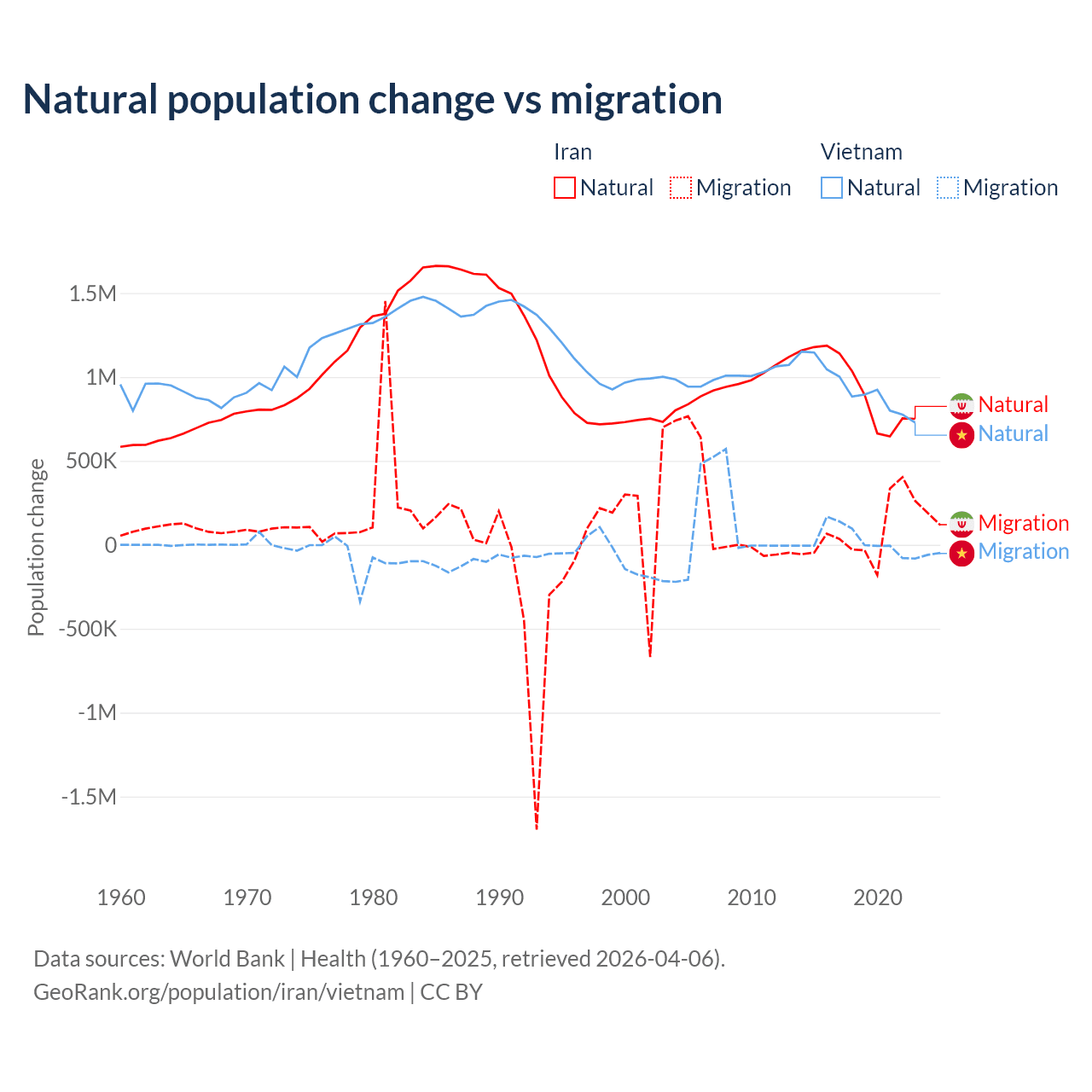 Over the last 10 years, 92.5% of the population change in Iran is from natural causes (a gain of 9,405,860 people) and 7.46% is from migration (a gain of 757,979 people). In Vietnam 97.7% is from natural causes (a gain of 9,349,756 people) and 2.29% is from migration (a gain of 219,073 people).