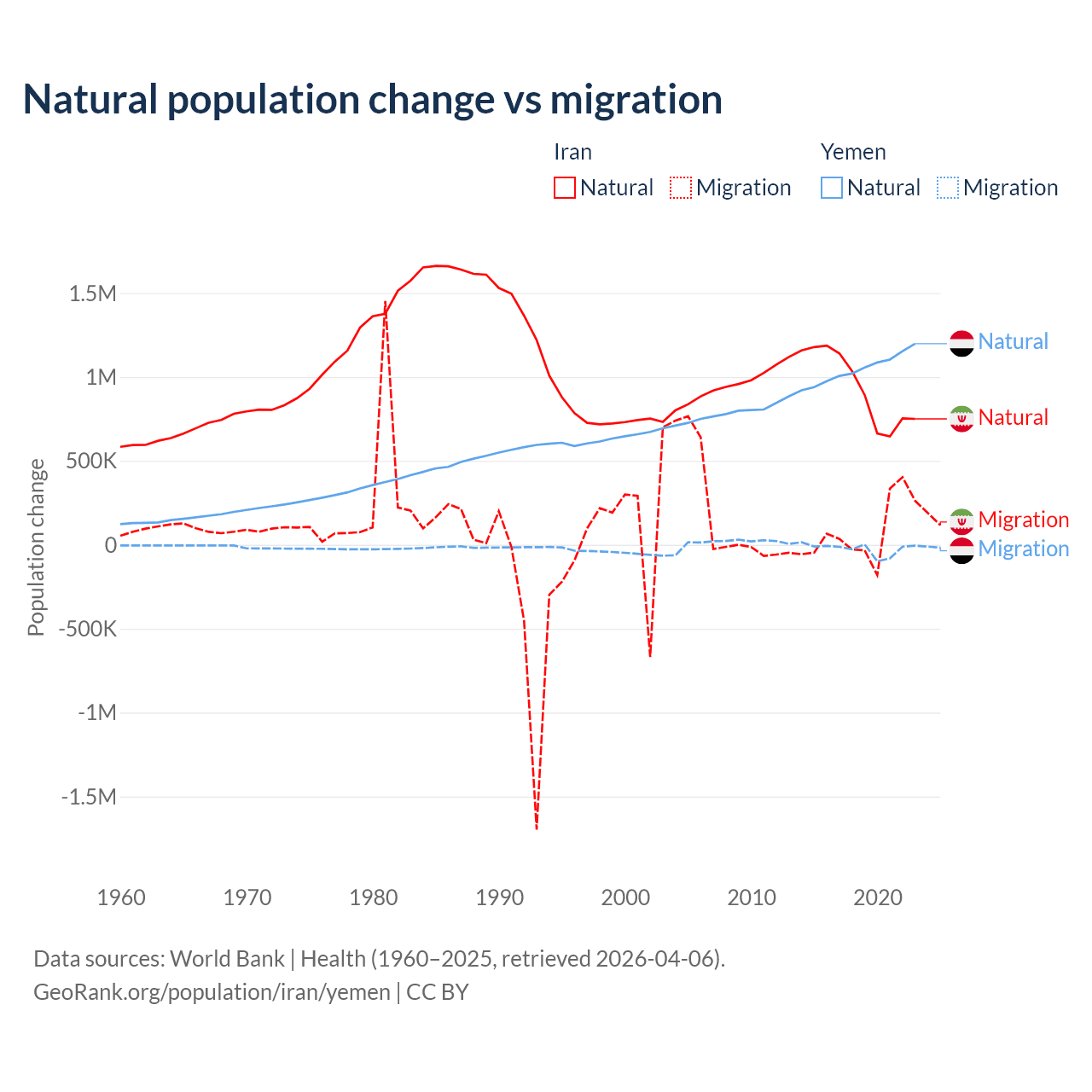 Over the last 10 years, 92.5% of the population change in Iran is from natural causes (a gain of 9,405,860 people) and 7.46% is from migration (a gain of 757,979 people). In Yemen 97.8% is from natural causes (a gain of 10,460,813 people) and 2.17% is from migration (a loss of 231,814 people).