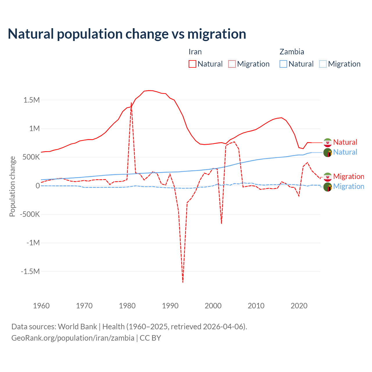 Over the last 10 years, 92.5% of the population change in Iran is from natural causes (a gain of 9,405,860 people) and 7.46% is from migration (a gain of 757,979 people). In Zambia 97.4% is from natural causes (a gain of 5,233,797 people) and 2.58% is from migration (a gain of 138,554 people).