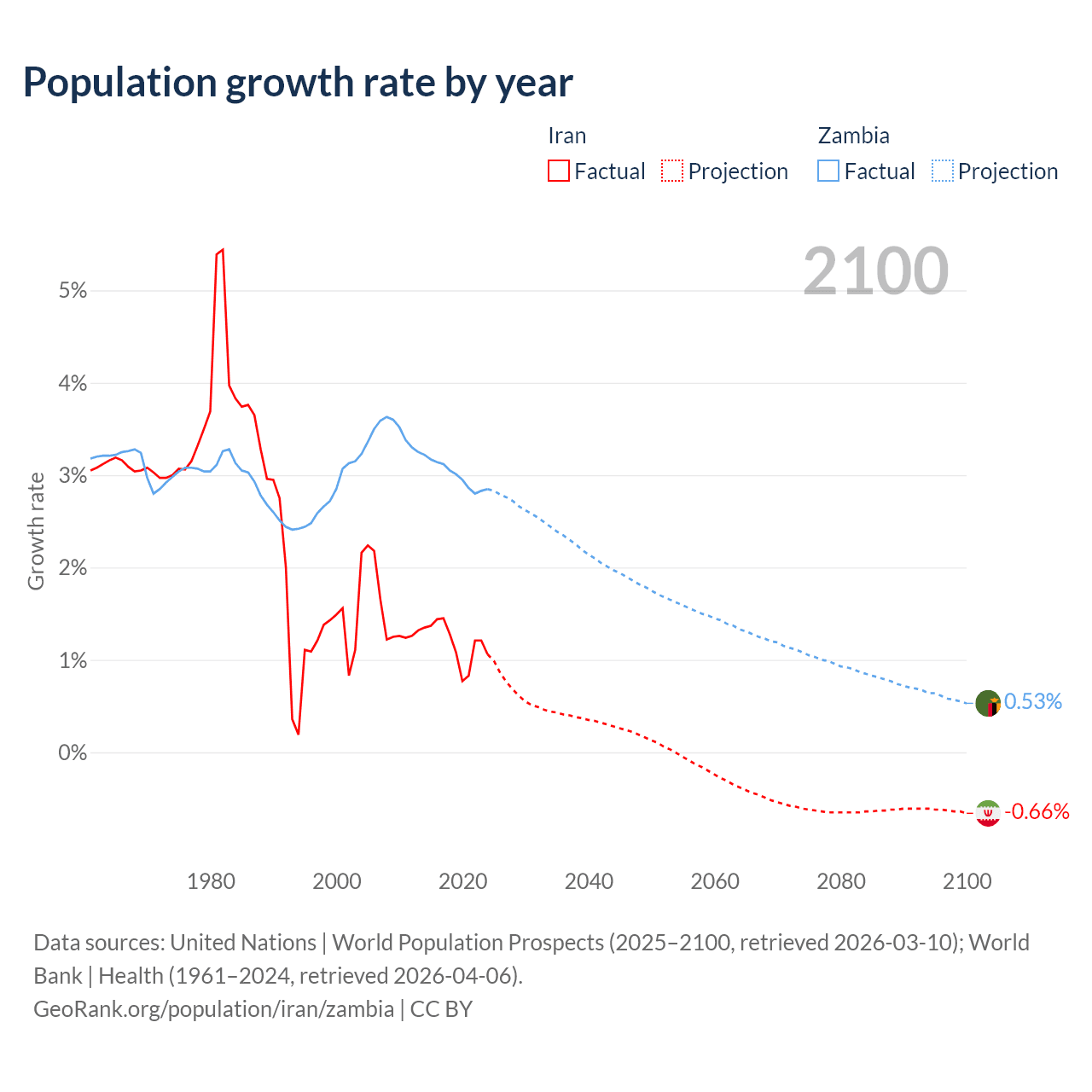 - For the last 10 years, Iran has had an average growth rate of +1.19% per year vs +3% in Zambia.