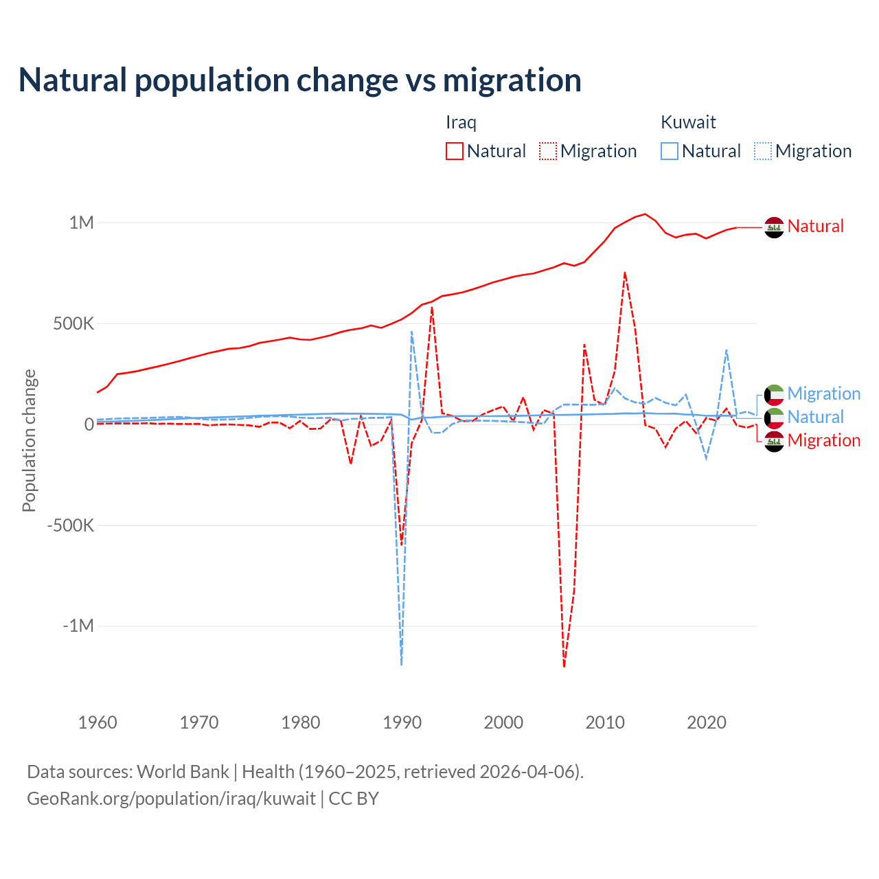 Over the last 10 years, 99.2% of the population change in Iraq is from natural causes (a gain of 9,598,842 people) and 0.76% is from migration (a loss of 73,050 people). In Kuwait 35.8% is from natural causes (a gain of 470,645 people) and 64.2% is from migration (a gain of 845,142 people).