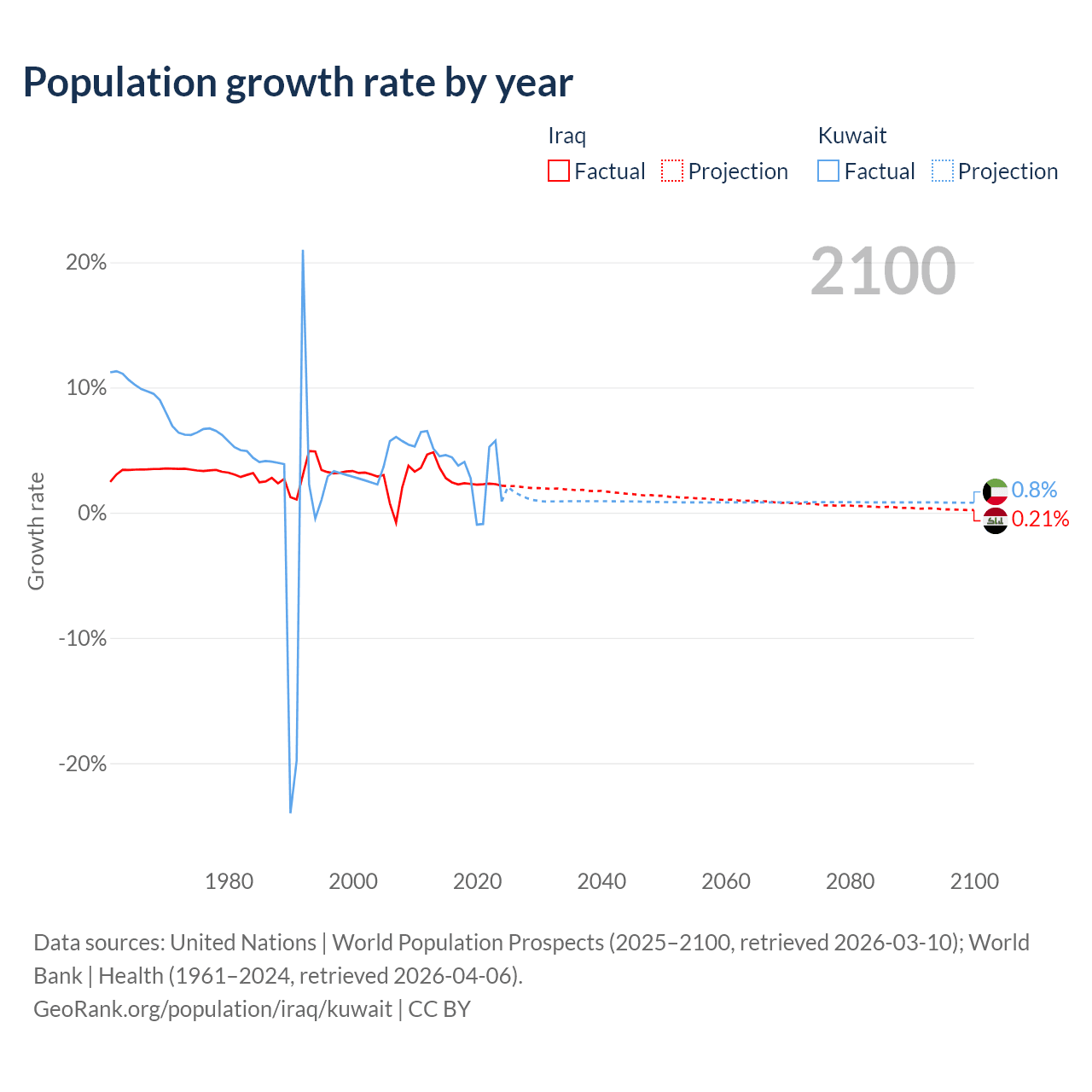 - For the last 10 years, Iraq has had an average growth rate of +2.45% per year vs +3.1% in Kuwait.