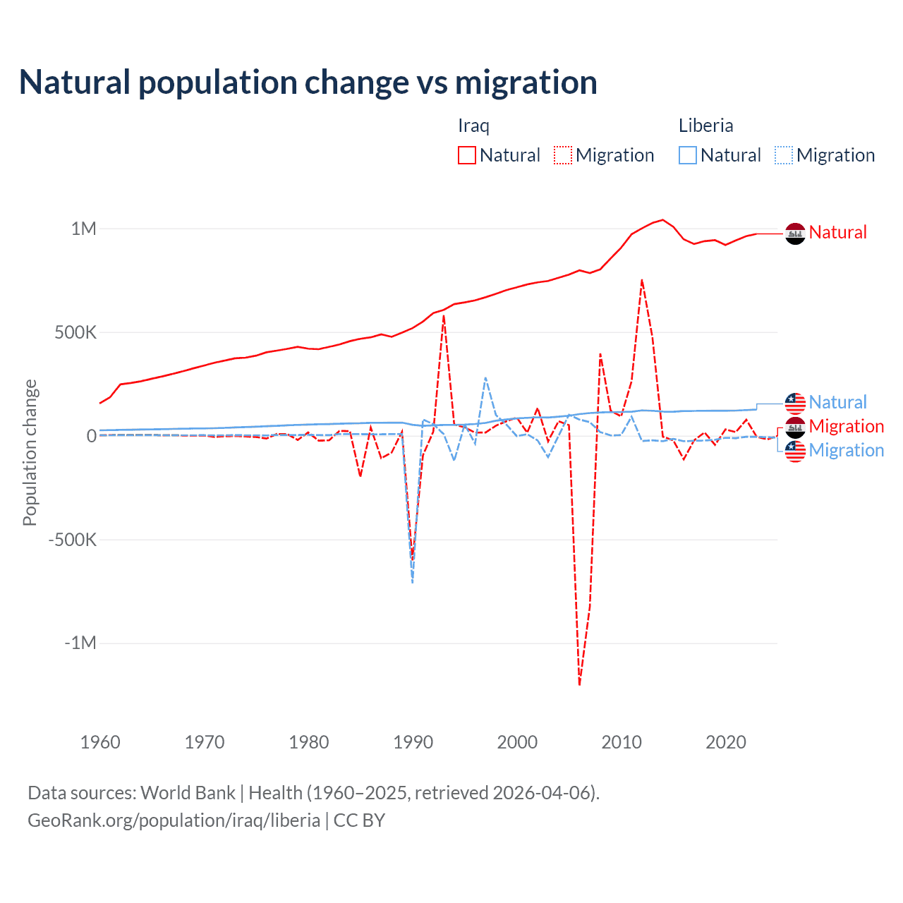 Over the last 10 years, 99.2% of the population change in Iraq is from natural causes (a gain of 9,598,842 people) and 0.76% is from migration (a loss of 73,050 people). In Liberia 87.7% is from natural causes (a gain of 1,202,387 people) and 12.3% is from migration (a loss of 168,316 people).