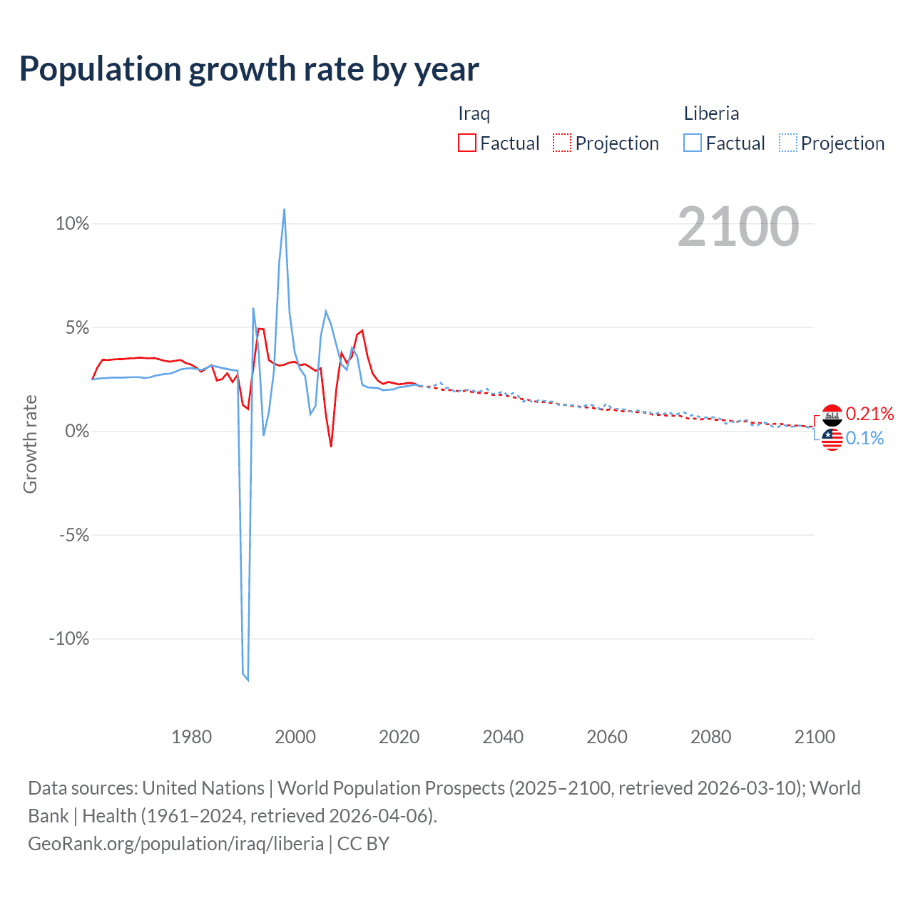 - For the last 10 years, Iraq has had an average growth rate of +2.45% per year vs +2.09% in Liberia.