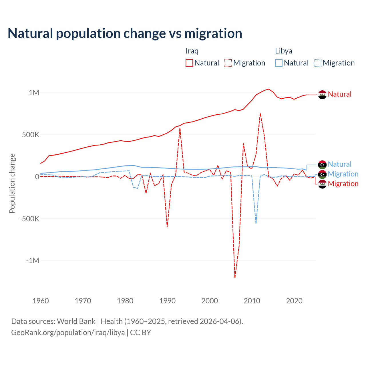 Over the last 10 years, 99.2% of the population change in Iraq is from natural causes (a gain of 9,598,842 people) and 0.76% is from migration (a loss of 73,050 people). In Libya 99.4% is from natural causes (a gain of 975,799 people) and 0.63% is from migration (a loss of 6,150 people).