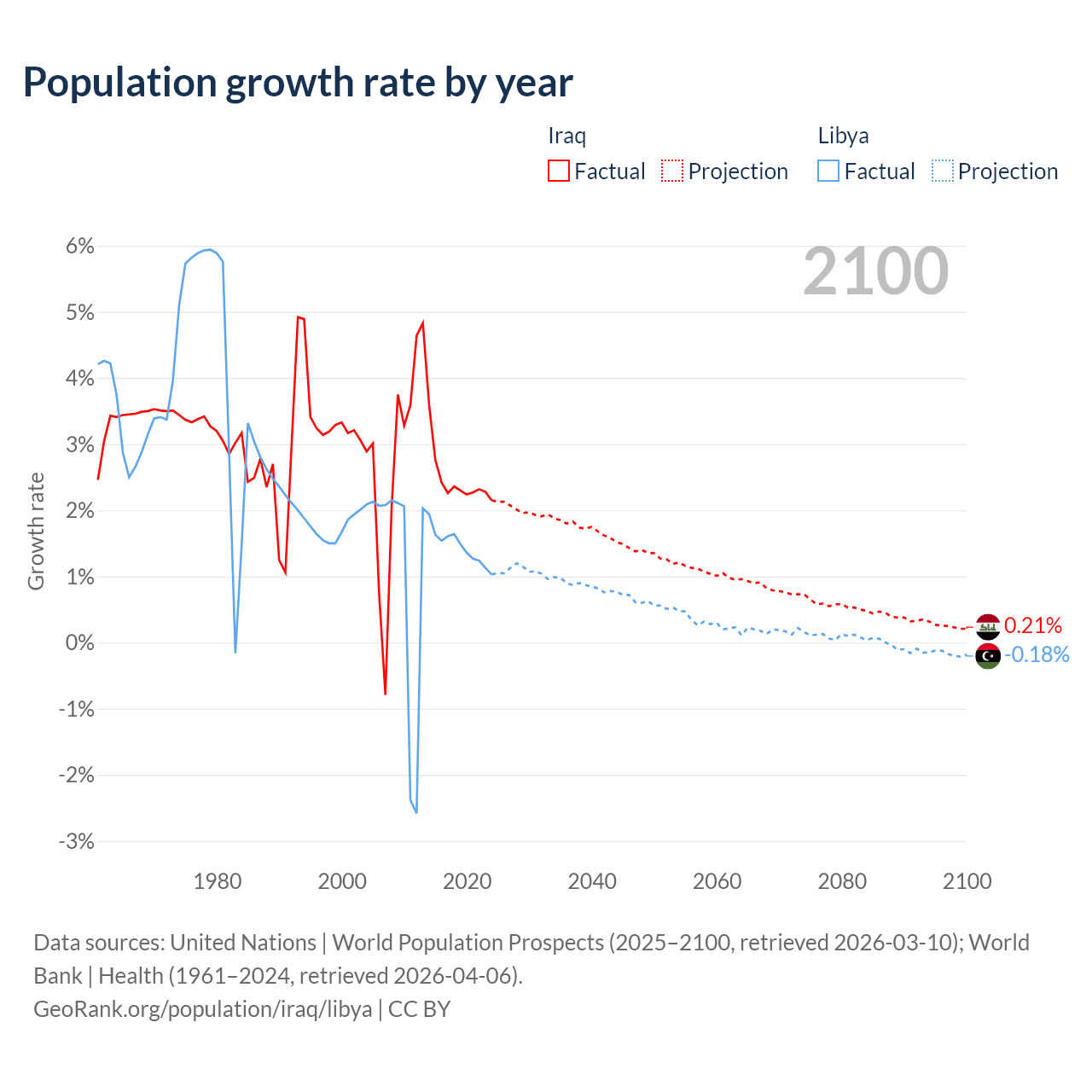 - For the last 10 years, Iraq has had an average growth rate of +2.45% per year vs +1.44% in Libya.
