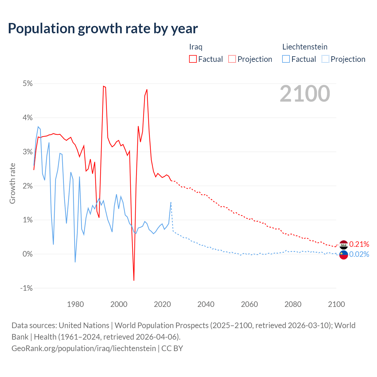 - For the last 10 years, Iraq has had an average growth rate of +2.45% per year vs +0.82% in Liechtenstein.