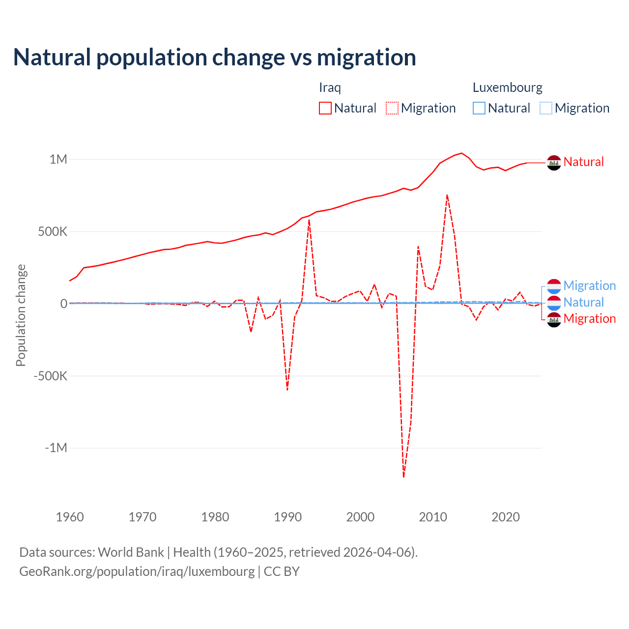 Over the last 10 years, 99.2% of the population change in Iraq is from natural causes (a gain of 9,598,842 people) and 0.76% is from migration (a loss of 73,050 people). In Luxembourg 16.8% is from natural causes (a gain of 20,287 people) and 83.2% is from migration (a gain of 100,435 people).