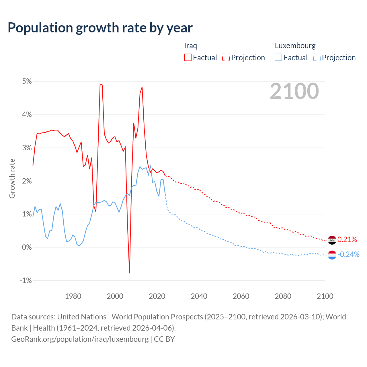 - For the last 10 years, Iraq has had an average growth rate of +2.45% per year vs +2.02% in Luxembourg.