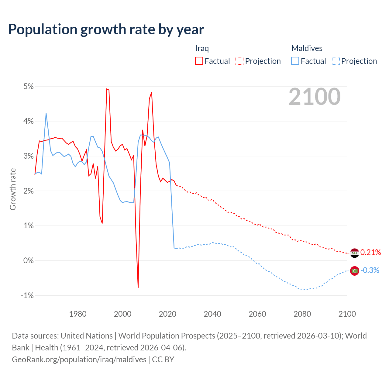 - For the last 10 years, Iraq has had an average growth rate of +2.45% per year vs +2.56% in Maldives.