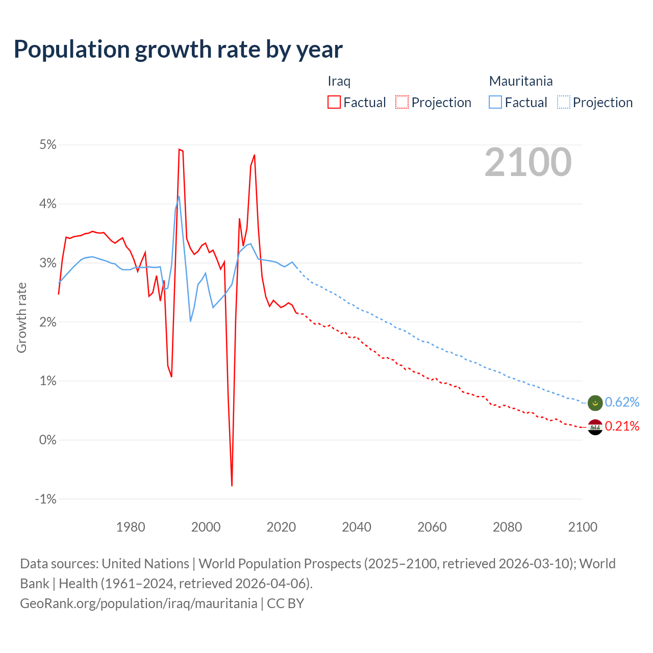 - For the last 10 years, Iraq has had an average growth rate of +2.45% per year vs +3% in Mauritania.