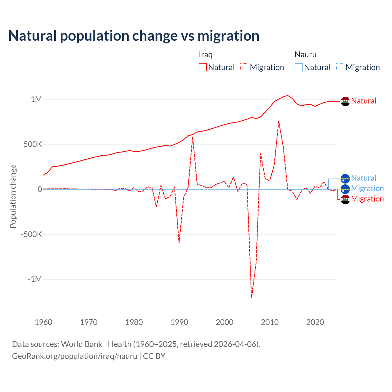 Over the last 10 years, 99.2% of the population change in Iraq is from natural causes (a gain of 9,598,842 people) and 0.76% is from migration (a loss of 73,050 people). In Nauru 66.2% is from natural causes (a gain of 2,590 people) and 33.8% is from migration (a loss of 1,320 people).