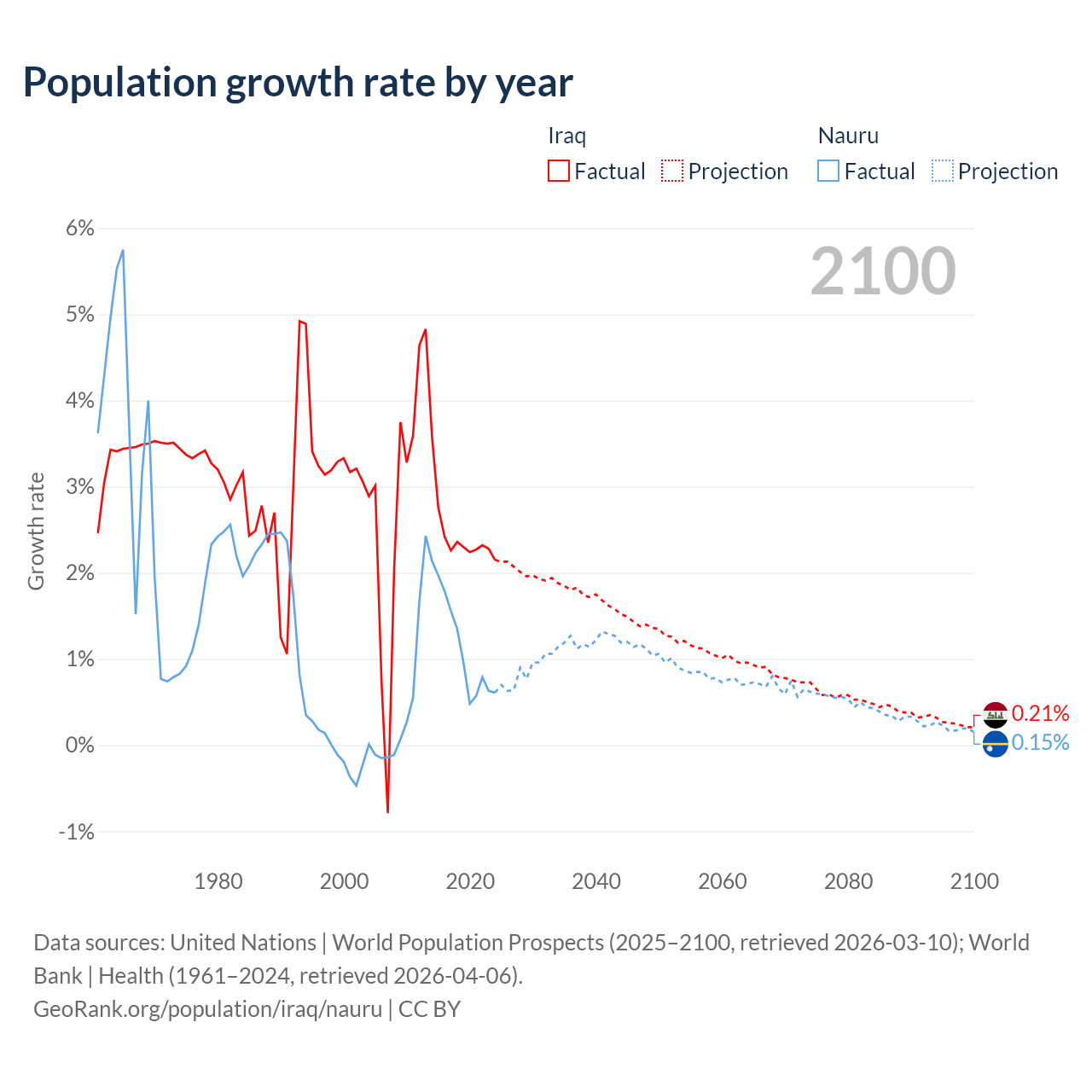 - For the last 10 years, Iraq has had an average growth rate of +2.45% per year vs +1.17% in Nauru.