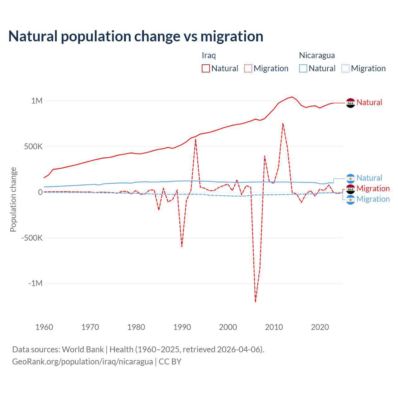 Over the last 10 years, 99.2% of the population change in Iraq is from natural causes (a gain of 9,598,842 people) and 0.76% is from migration (a loss of 73,050 people). In Nicaragua 85.5% is from natural causes (a gain of 1,017,084 people) and 14.5% is from migration (a loss of 172,078 people).