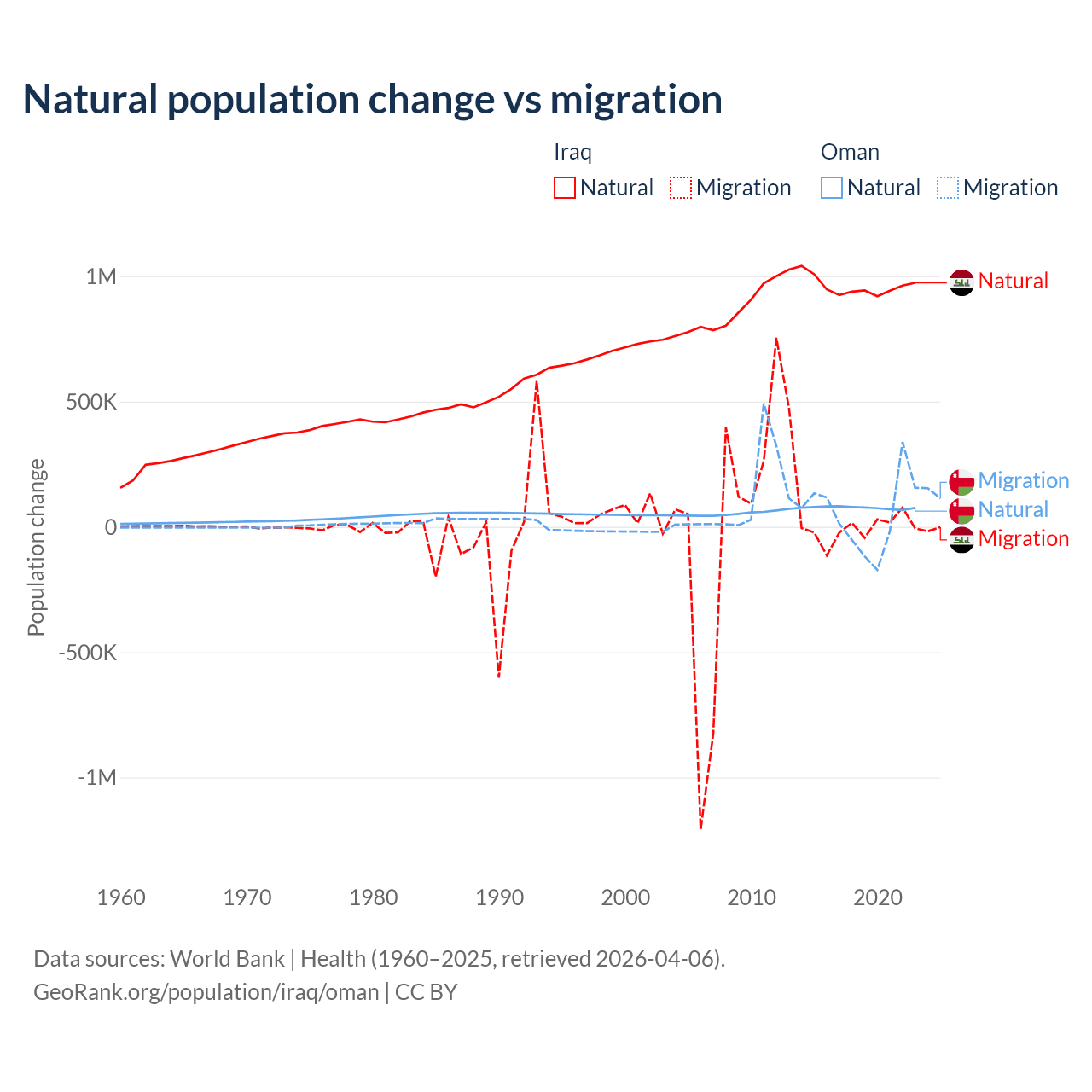 Over the last 10 years, 99.2% of the population change in Iraq is from natural causes (a gain of 9,598,842 people) and 0.76% is from migration (a loss of 73,050 people). In Oman 61.6% is from natural causes (a gain of 763,049 people) and 38.4% is from migration (a gain of 475,565 people).