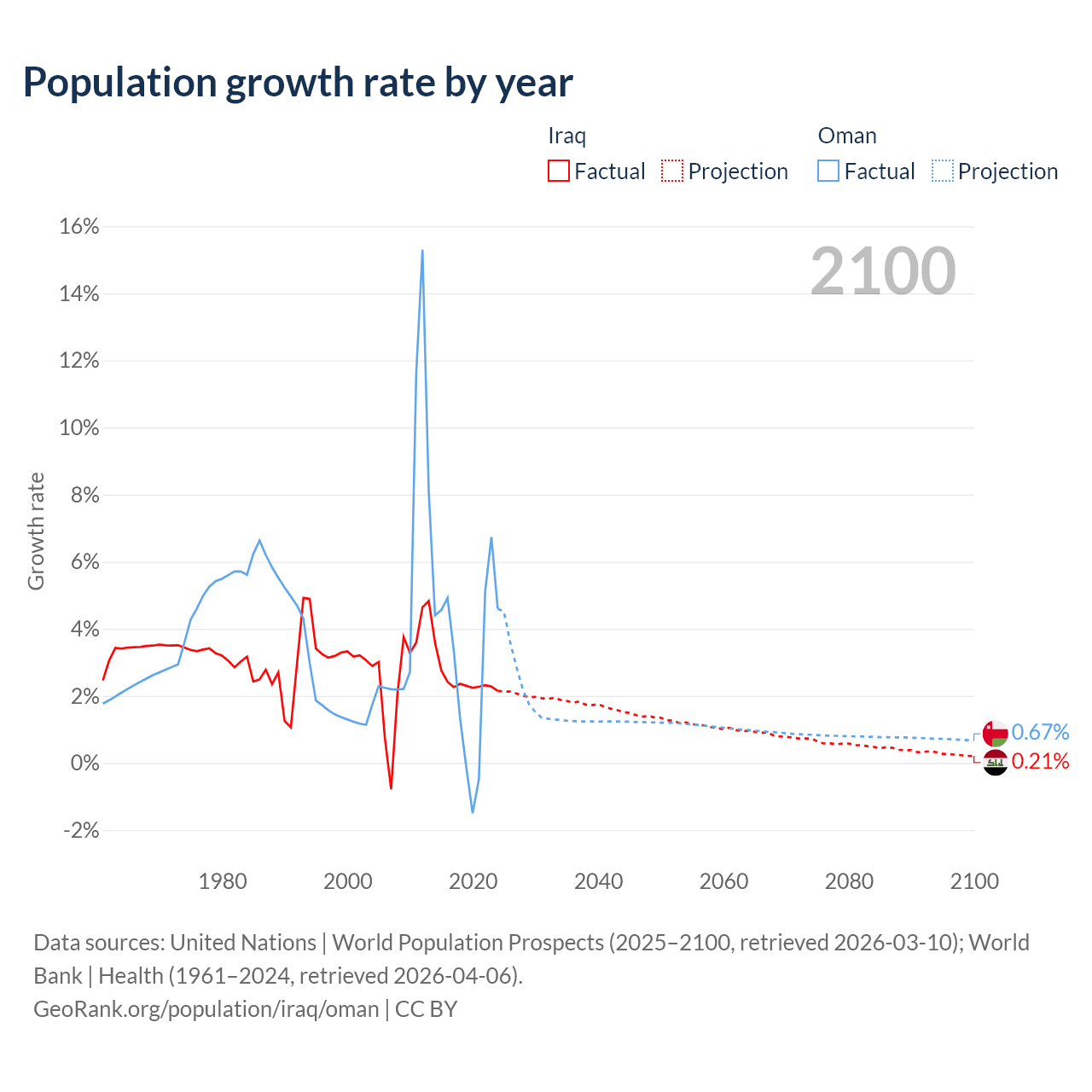 - For the last 10 years, Iraq has had an average growth rate of +2.45% per year vs +2.99% in Oman.