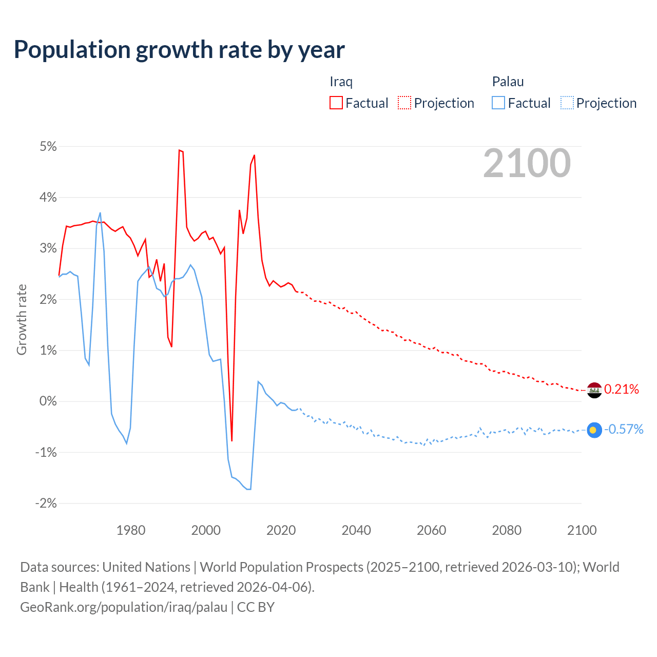 - For the last 10 years, Iraq has had an average growth rate of +2.45% per year vs +0.02% in Palau.