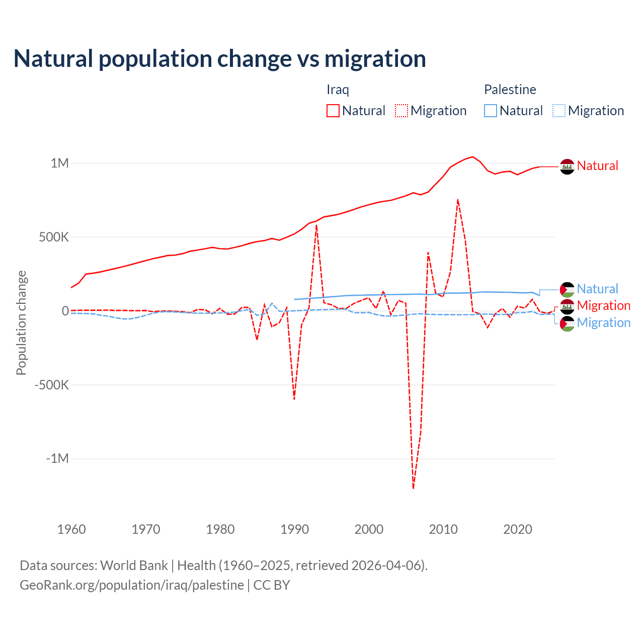 Over the last 10 years, 99.2% of the population change in Iraq is from natural causes (a gain of 9,598,842 people) and 0.76% is from migration (a loss of 73,050 people). In Palestine 85.7% is from natural causes (a gain of 1,218,010 people) and 14.3% is from migration (a loss of 202,820 people).
