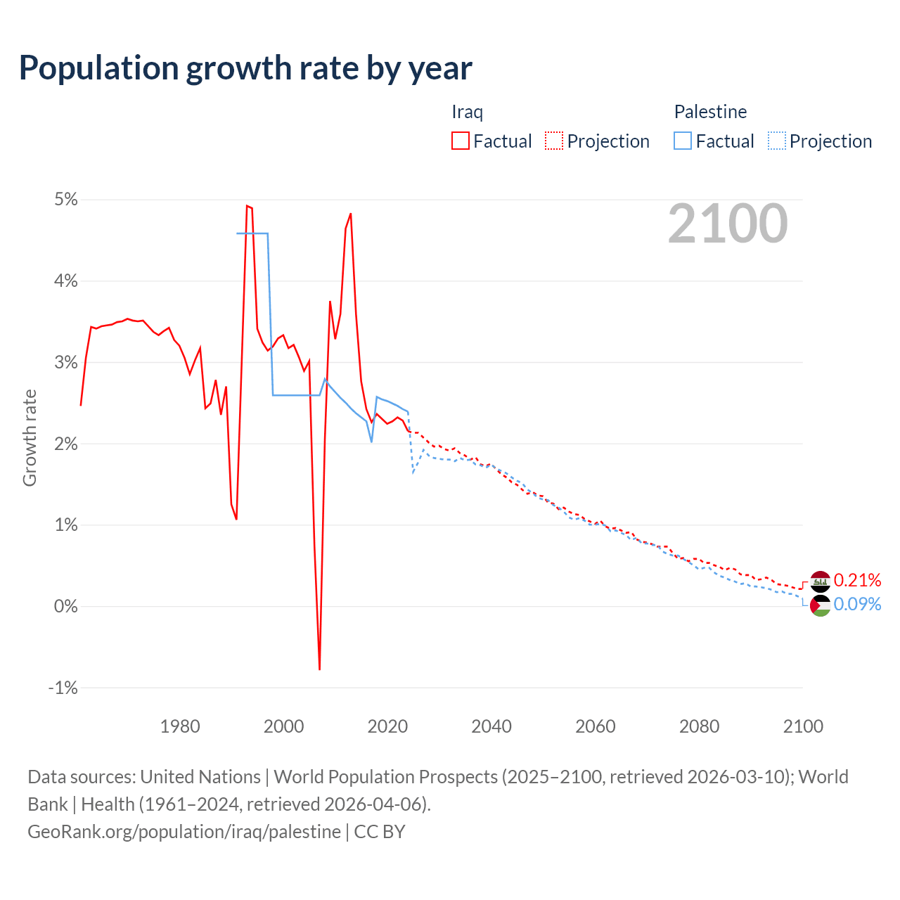 - For the last 10 years, Iraq has had an average growth rate of +2.45% per year vs +2.4% in Palestine.