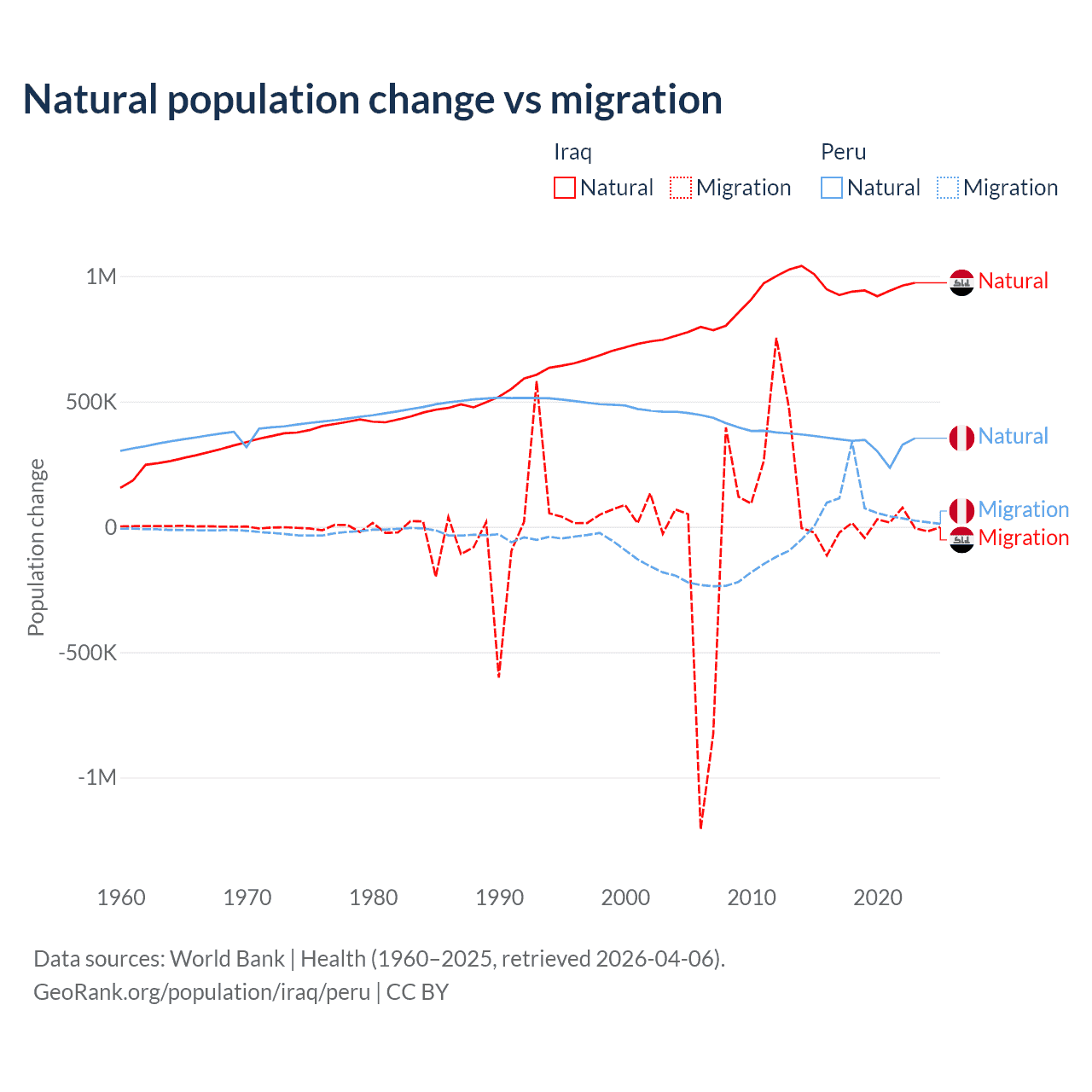 Over the last 10 years, 99.2% of the population change in Iraq is from natural causes (a gain of 9,598,842 people) and 0.76% is from migration (a loss of 73,050 people). In Peru 82% is from natural causes (a gain of 3,345,822 people) and 18% is from migration (a gain of 732,505 people).