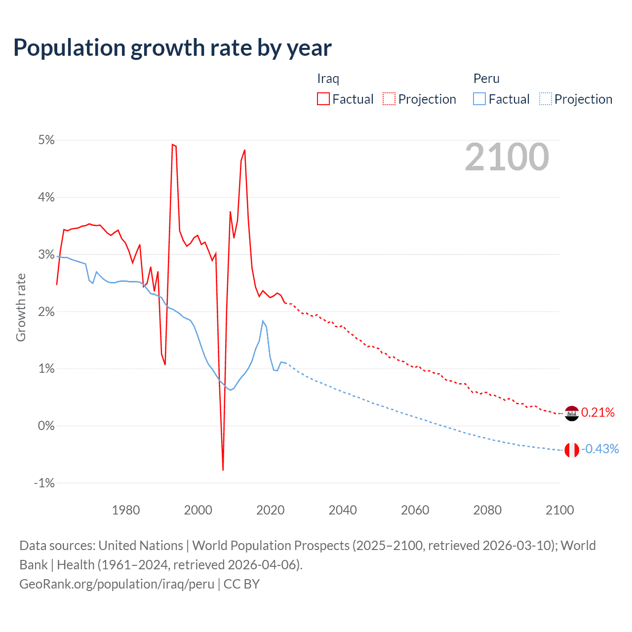 - For the last 10 years, Iraq has had an average growth rate of +2.45% per year vs +1.26% in Peru.