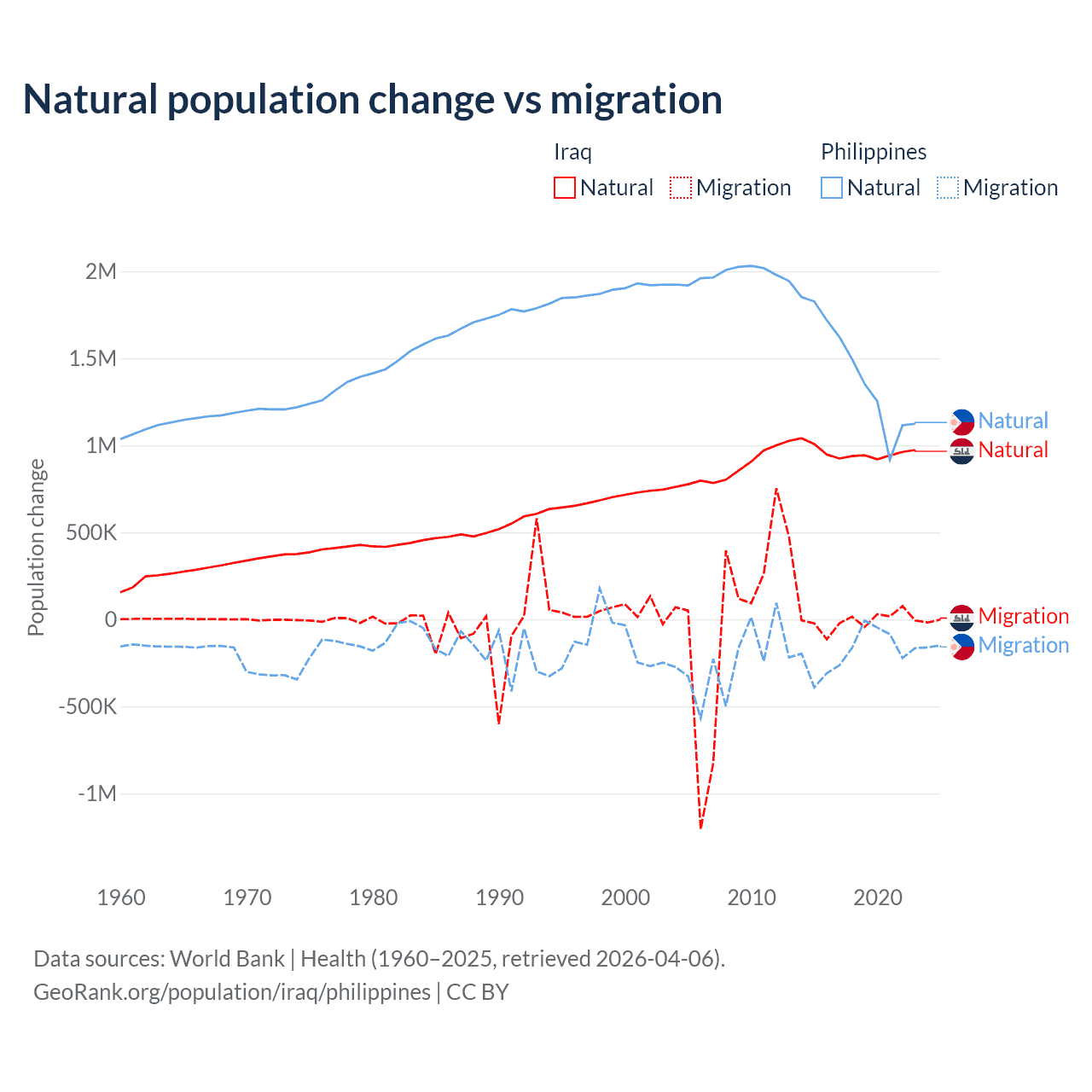 Over the last 10 years, 99.2% of the population change in Iraq is from natural causes (a gain of 9,598,842 people) and 0.76% is from migration (a loss of 73,050 people). In the Philippines 88.5% is from natural causes (a gain of 14,279,705 people) and 11.5% is from migration (a loss of 1,848,117 people).