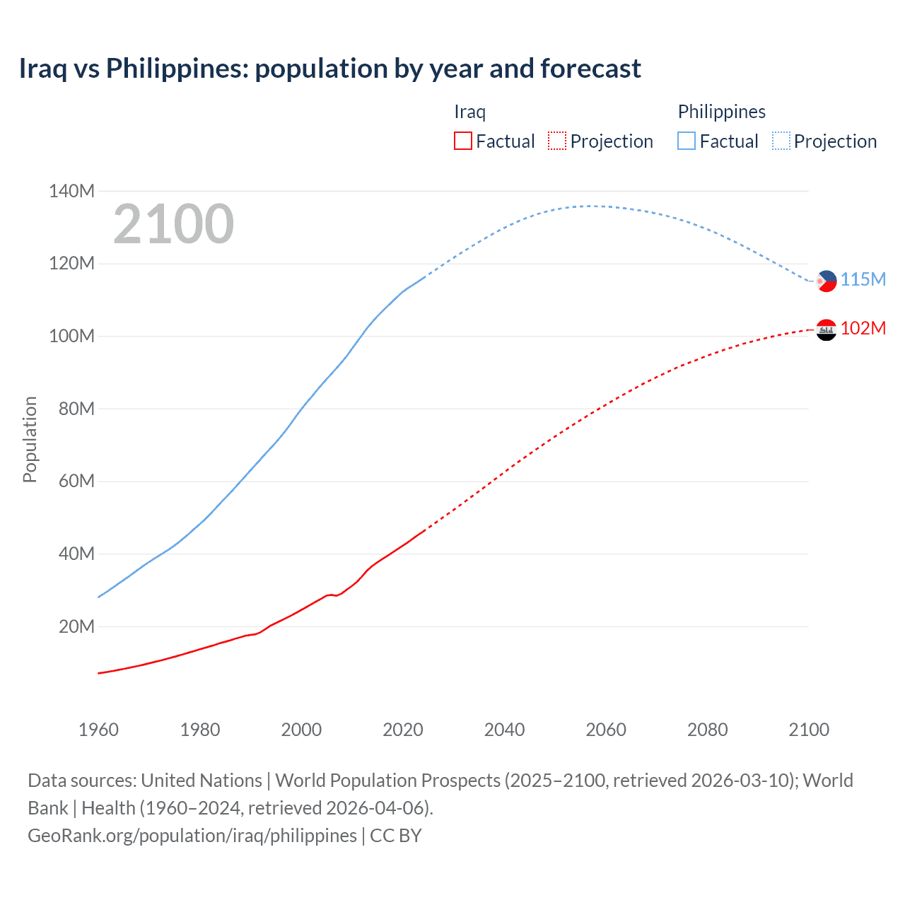 The latest officially reported population of Iraq was 46,042,015 in 2024 vs 115,843,670 people in the Philippines in 2024. In 2026, based on the adjusted UN estimation, the current Iraq's population is 48,289,334 people compared to 117,991,570 in the Philippines.