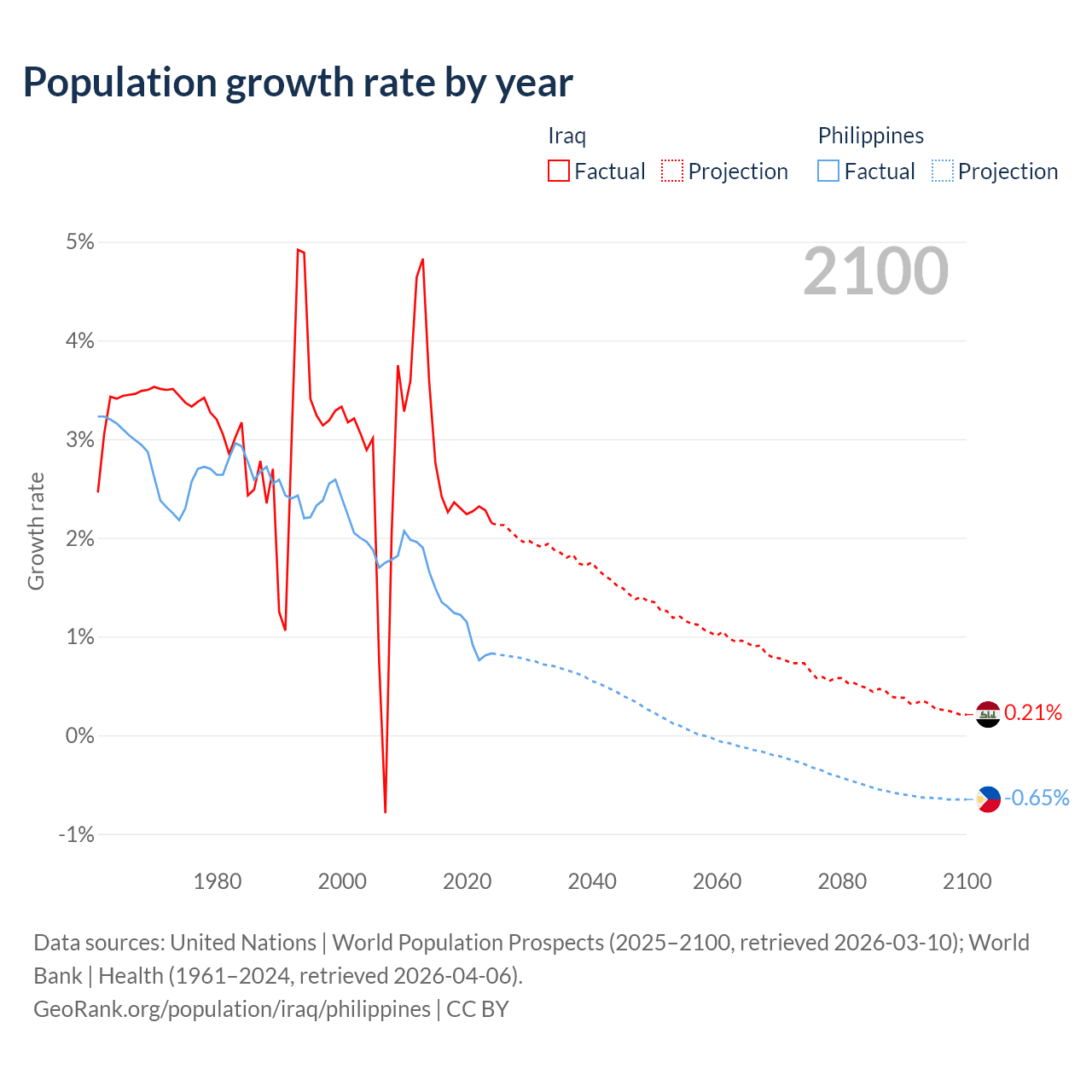 - For the last 10 years, Iraq has had an average growth rate of +2.45% per year vs +1.16% in the Philippines.