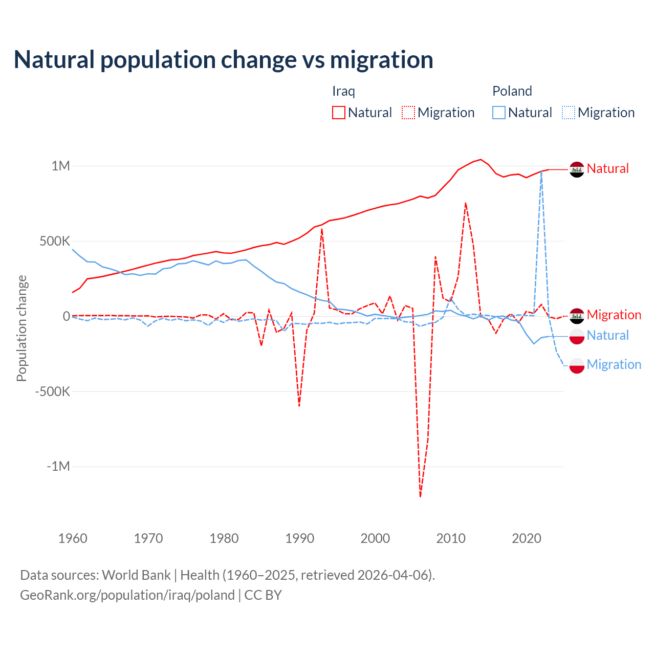 Over the last 10 years, 99.2% of the population change in Iraq is from natural causes (a gain of 9,598,842 people) and 0.76% is from migration (a loss of 73,050 people). In Poland 41.4% is from natural causes (a loss of 675,443 people) and 58.6% is from migration (a gain of 955,766 people).