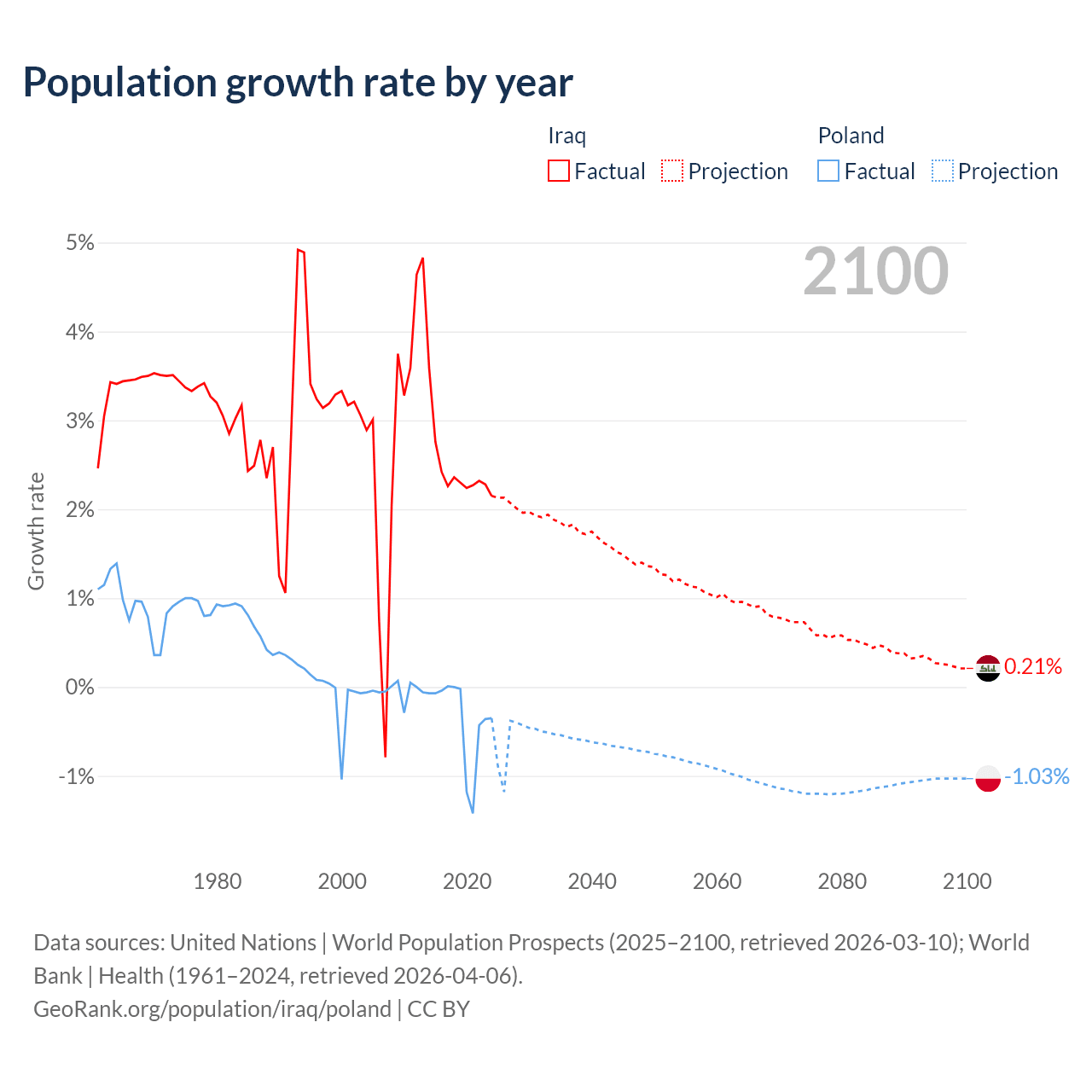 - For the last 10 years, Iraq has had an average growth rate of +2.45% per year vs -0.36% in Poland.