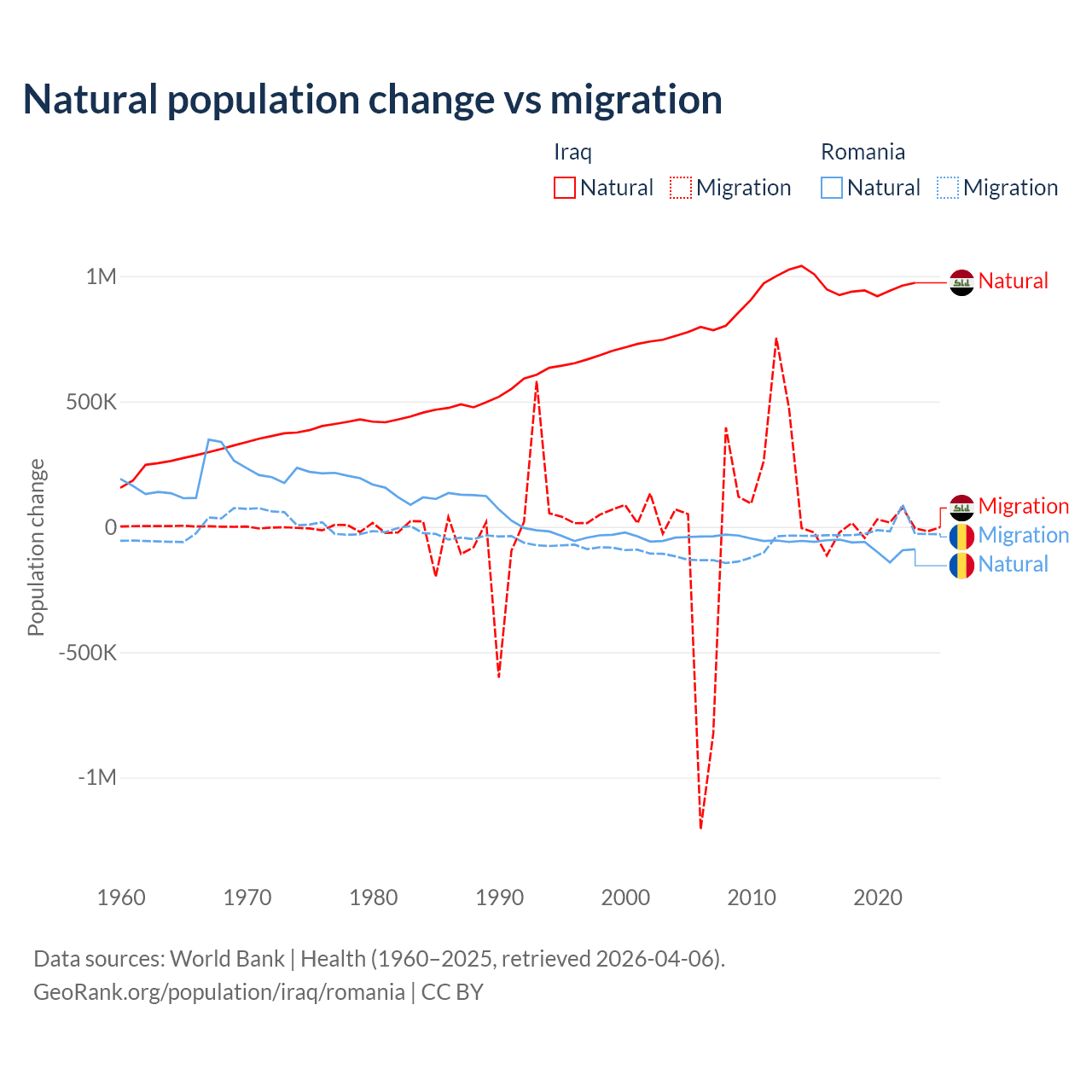 Over the last 10 years, 99.2% of the population change in Iraq is from natural causes (a gain of 9,598,842 people) and 0.76% is from migration (a loss of 73,050 people). In Romania 82% is from natural causes (a loss of 766,295 people) and 18% is from migration (a loss of 167,917 people).