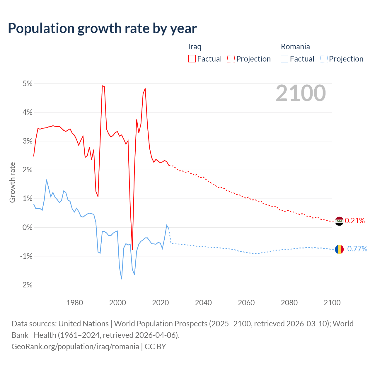 - For the last 10 years, Iraq has had an average growth rate of +2.45% per year vs -0.43% in Romania.