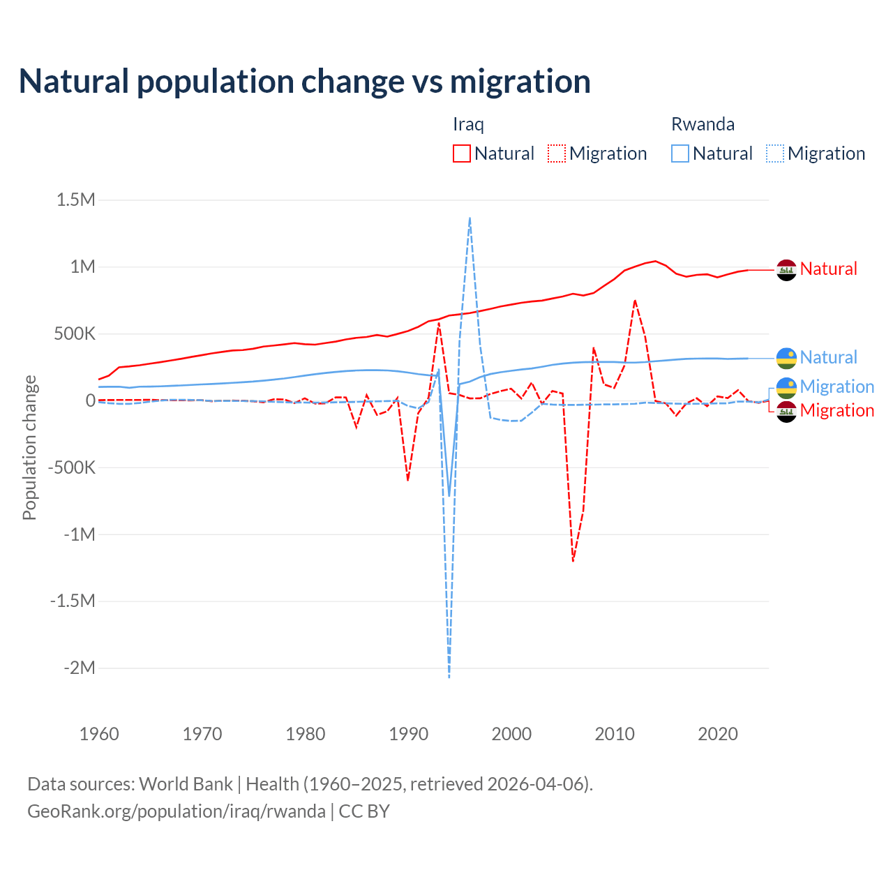 Over the last 10 years, 99.2% of the population change in Iraq is from natural causes (a gain of 9,598,842 people) and 0.76% is from migration (a loss of 73,050 people). In Rwanda 93.8% is from natural causes (a gain of 3,081,296 people) and 6.18% is from migration (a loss of 203,035 people).