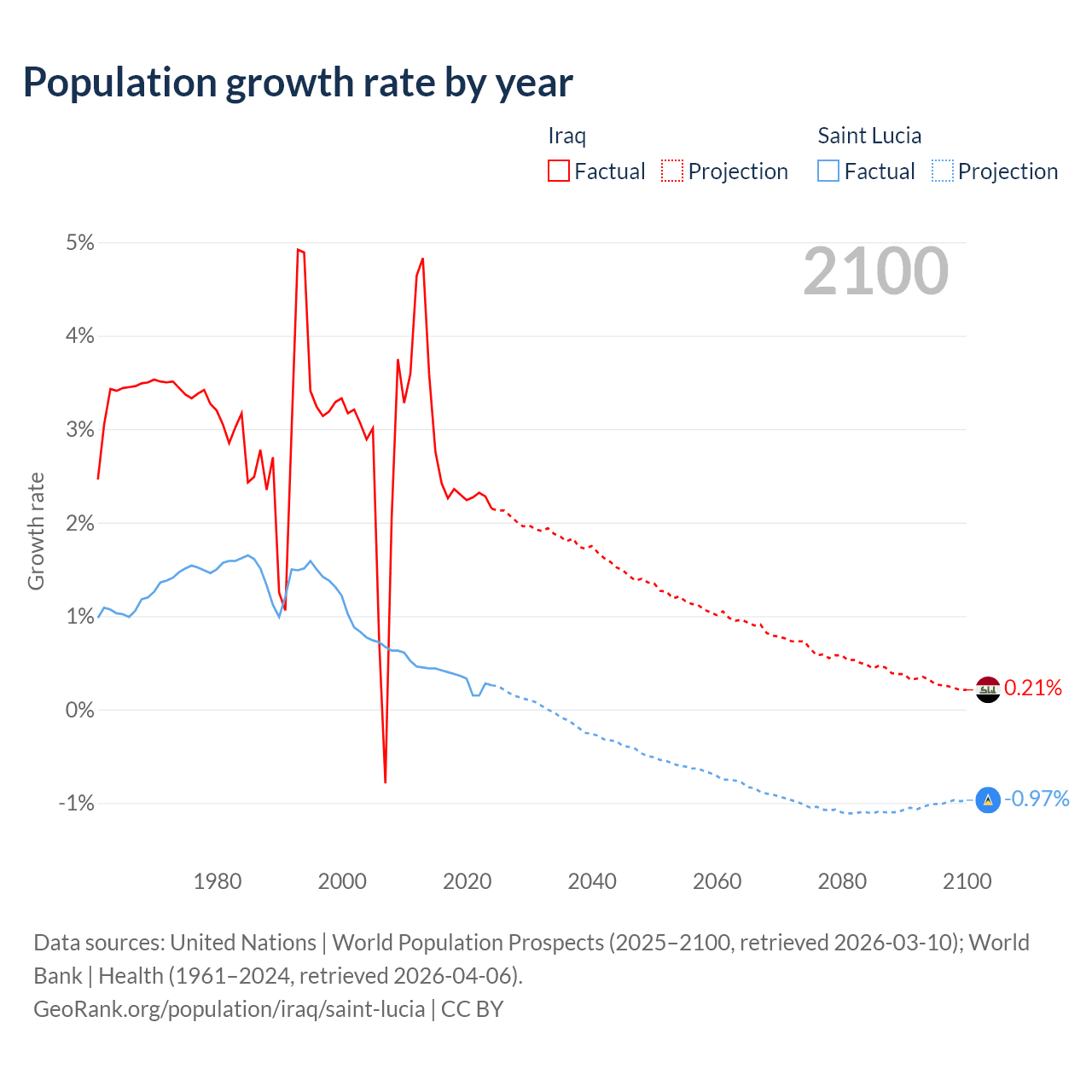 - For the last 10 years, Iraq has had an average growth rate of +2.45% per year vs +0.33% in Saint Lucia.