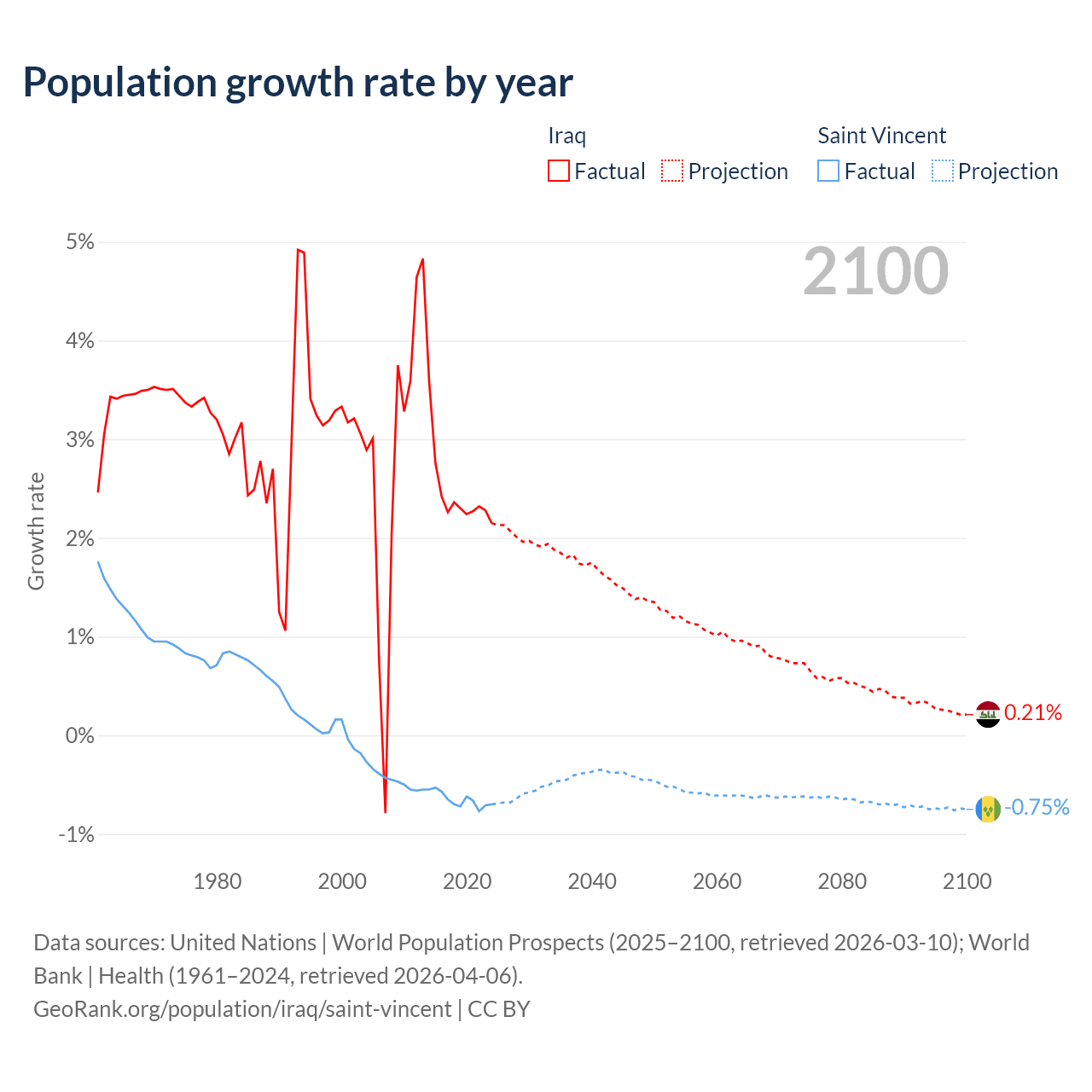 - For the last 10 years, Iraq has had an average growth rate of +2.45% per year vs -0.65% in Saint Vincent.