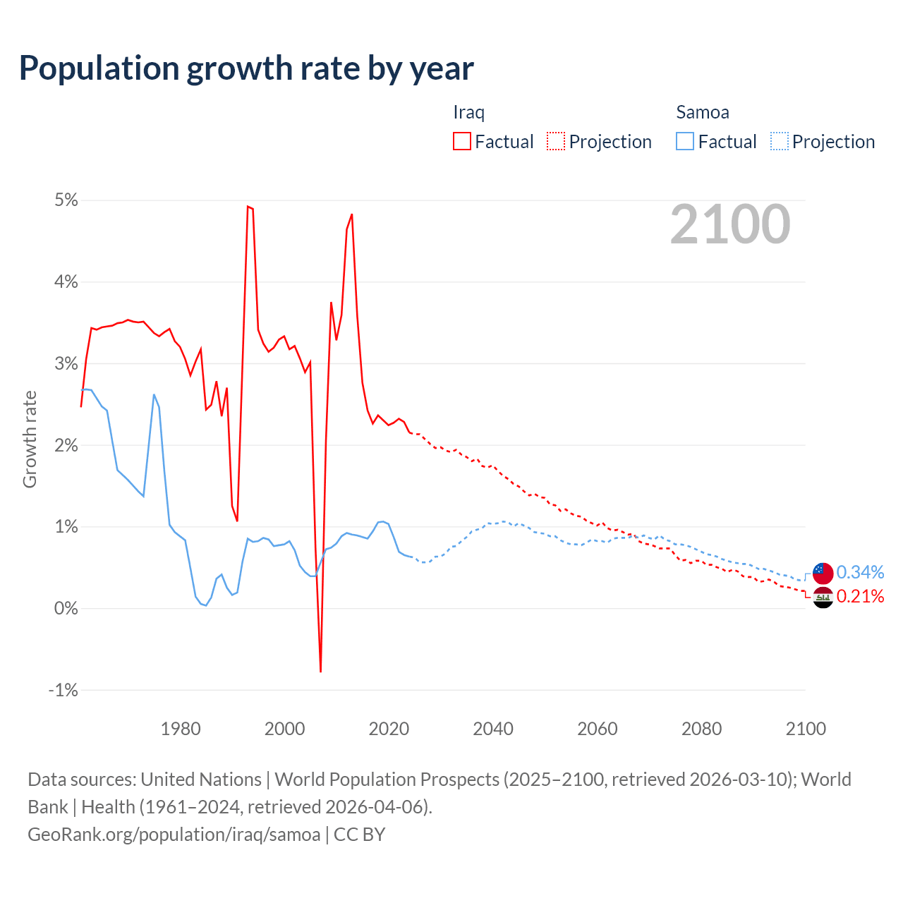 - For the last 10 years, Iraq has had an average growth rate of +2.45% per year vs +0.87% in Samoa.