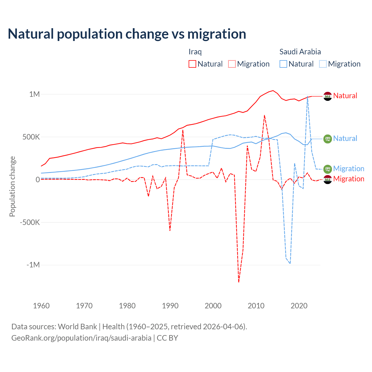 Over the last 10 years, 99.2% of the population change in Iraq is from natural causes (a gain of 9,598,842 people) and 0.76% is from migration (a loss of 73,050 people). In Saudi Arabia 93.9% is from natural causes (a gain of 4,829,562 people) and 6.05% is from migration (a gain of 311,209 people).