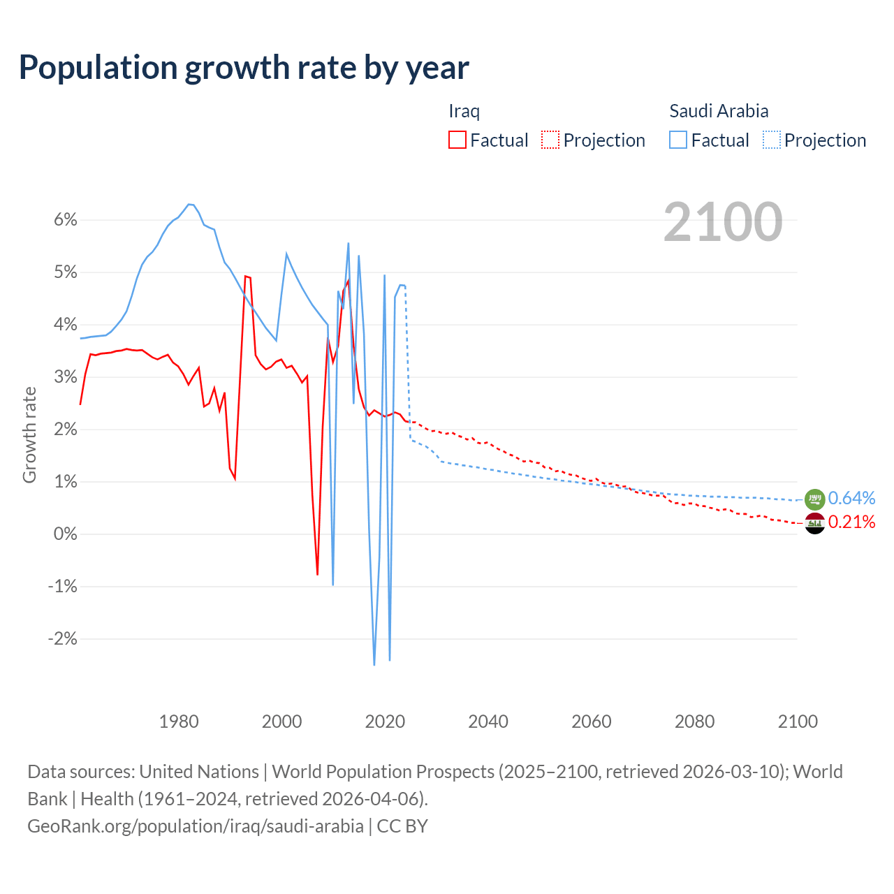 - For the last 10 years, Iraq has had an average growth rate of +2.45% per year vs +2.3% in Saudi Arabia.
