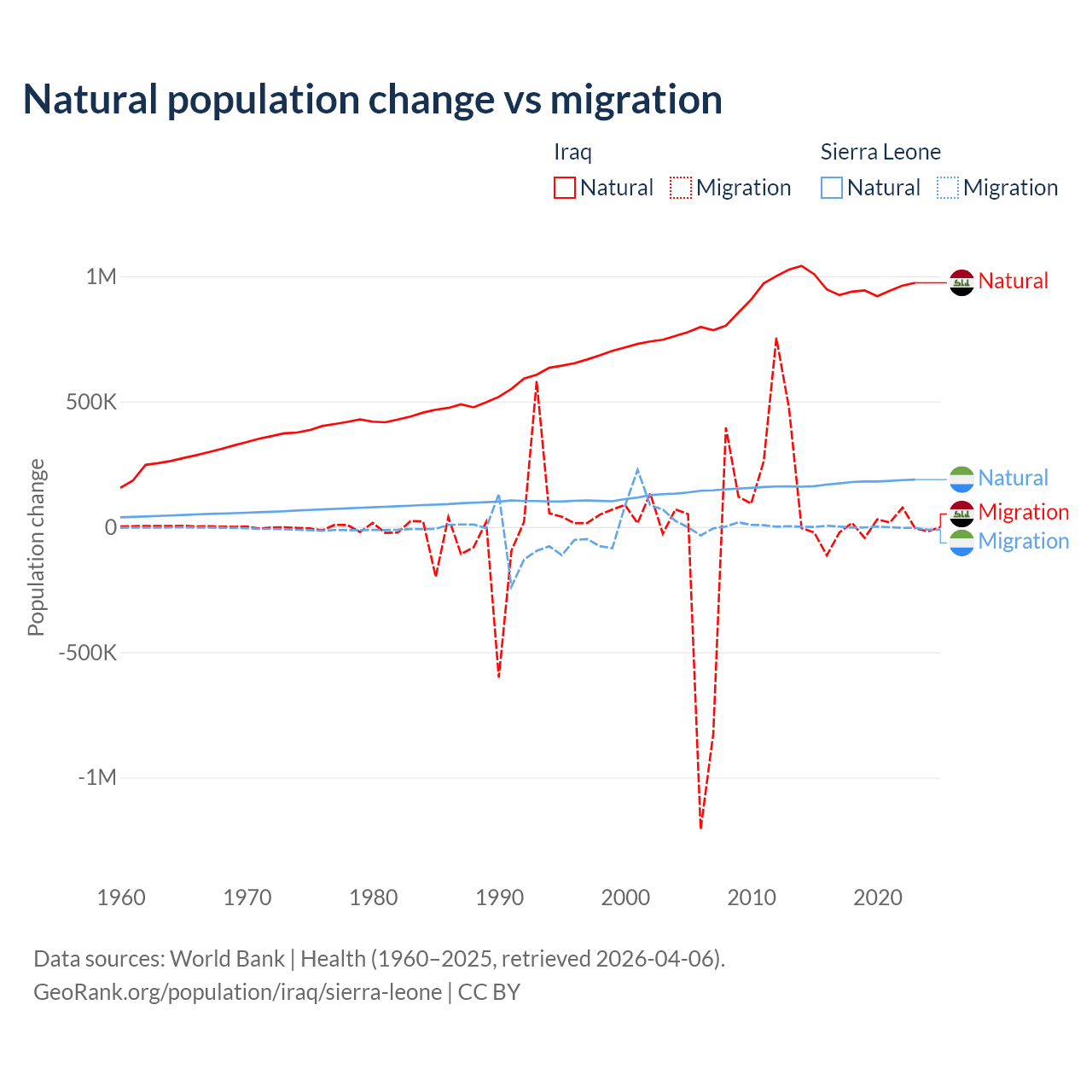 Over the last 10 years, 99.2% of the population change in Iraq is from natural causes (a gain of 9,598,842 people) and 0.76% is from migration (a loss of 73,050 people). In Sierra Leone 99.6% is from natural causes (a gain of 1,764,049 people) and 0.41% is from migration (a loss of 7,211 people).