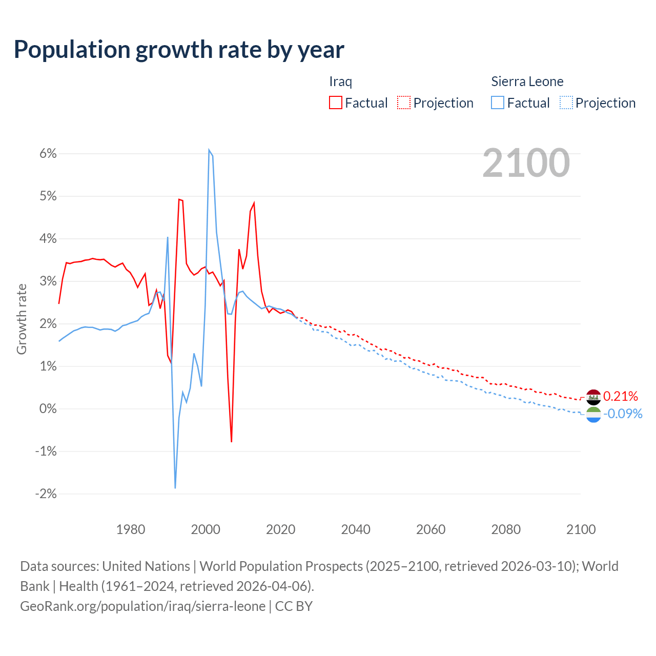 - For the last 10 years, Iraq has had an average growth rate of +2.45% per year vs +2.32% in Sierra Leone.