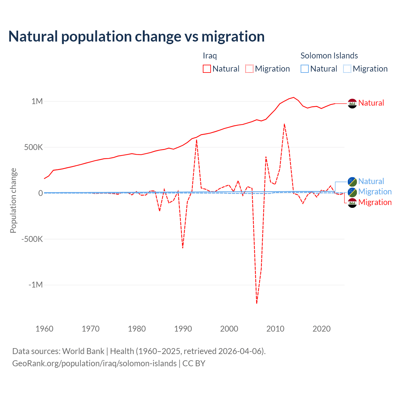 Over the last 10 years, 99.2% of the population change in Iraq is from natural causes (a gain of 9,598,842 people) and 0.76% is from migration (a loss of 73,050 people). In the Solomon Islands 82.8% is from natural causes (a gain of 168,727 people) and 17.2% is from migration (a gain of 35,031 people).