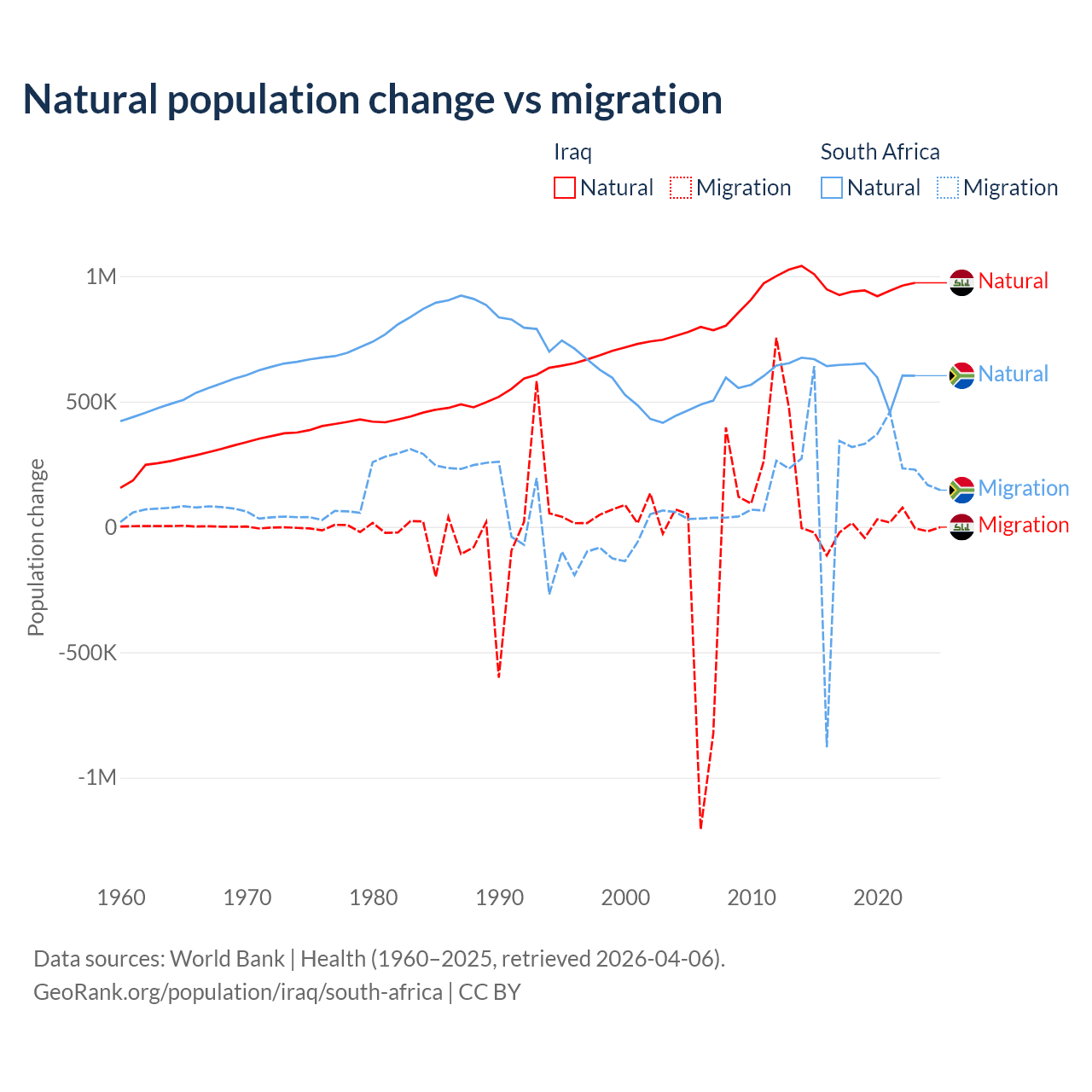 Over the last 10 years, 99.2% of the population change in Iraq is from natural causes (a gain of 9,598,842 people) and 0.76% is from migration (a loss of 73,050 people). In South Africa 72.8% is from natural causes (a gain of 6,190,027 people) and 27.2% is from migration (a gain of 2,316,795 people).