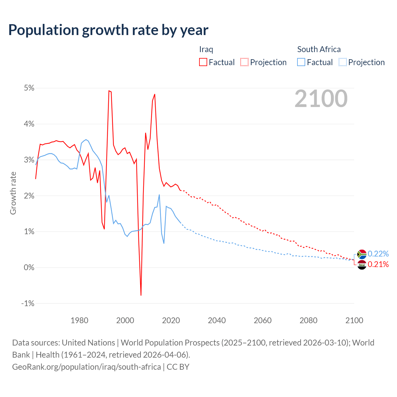 - For the last 10 years, Iraq has had an average growth rate of +2.45% per year vs +1.44% in South Africa.