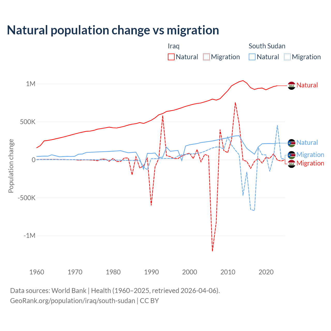 Over the last 10 years, 99.2% of the population change in Iraq is from natural causes (a gain of 9,598,842 people) and 0.76% is from migration (a loss of 73,050 people). In South Sudan 57.4% is from natural causes (a gain of 1,792,135 people) and 42.6% is from migration (a loss of 1,329,606 people).