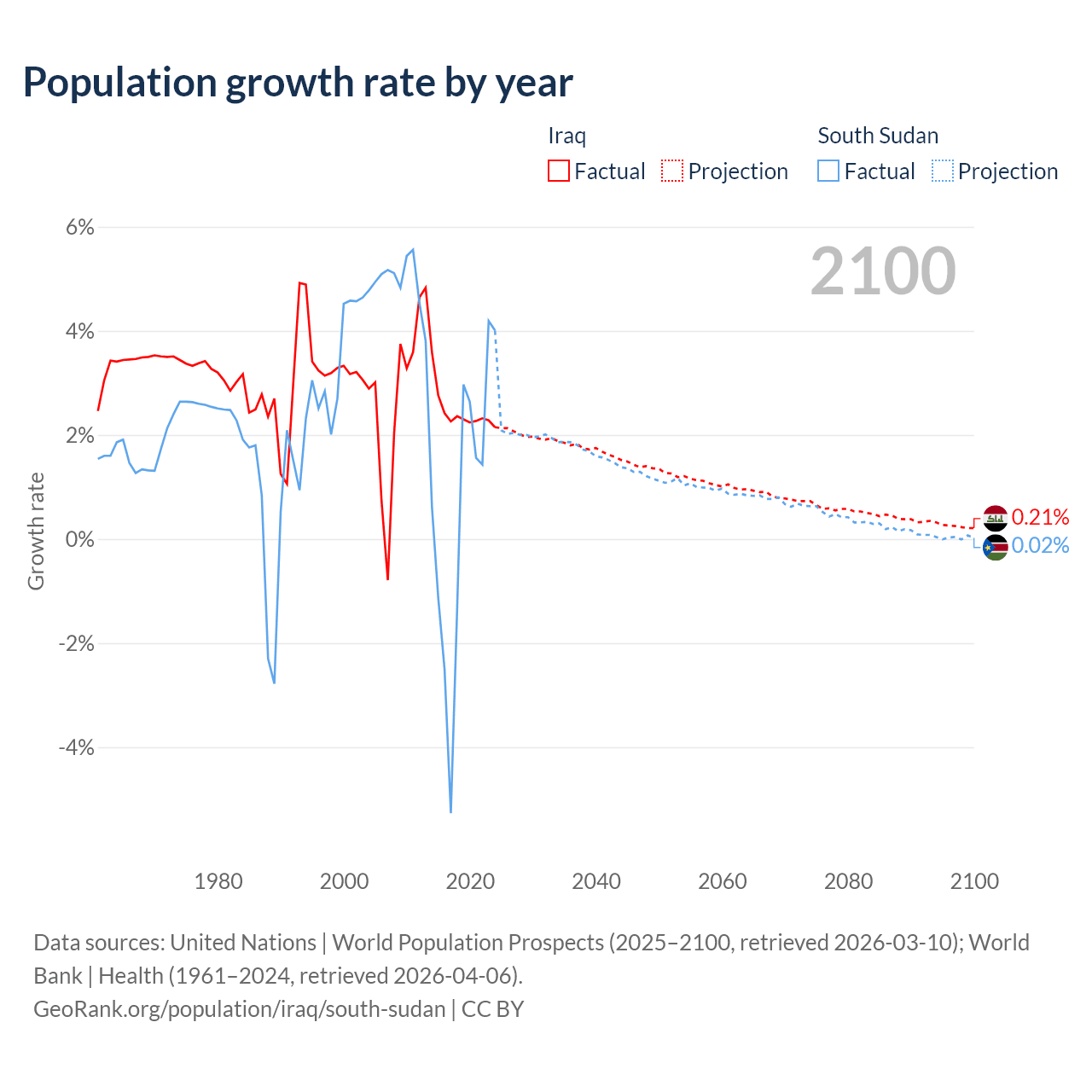 - For the last 10 years, Iraq has had an average growth rate of +2.45% per year vs +0.65% in South Sudan.