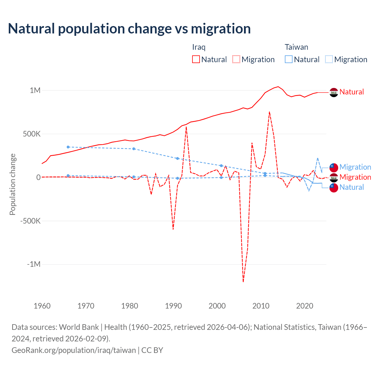 Over the last 10 years, 99.2% of the population change in Iraq is from natural causes (a gain of 9,598,842 people) and 0.76% is from migration (a loss of 73,050 people). In Taiwan 56.7% is from natural causes (a loss of 57,467 people) and 43.3% is from migration (a gain of 43,884 people).